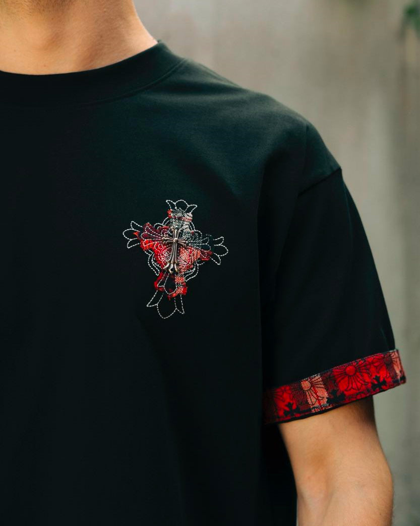 Футболка Chrome Hearts створена з м’якої та довговічної бавовни, що гарантує комфорт протягом дня. Класичний фасон і округлий виріз забезпечують зручну посадку. Унікальна вишивка хреста з металевим елементом на грудях додає виразності, а декоративні манжети з орнаментом підкреслюють фірмовий характер речі. Чудовий вибір для тих, хто любить стильні деталі й оригінальність.