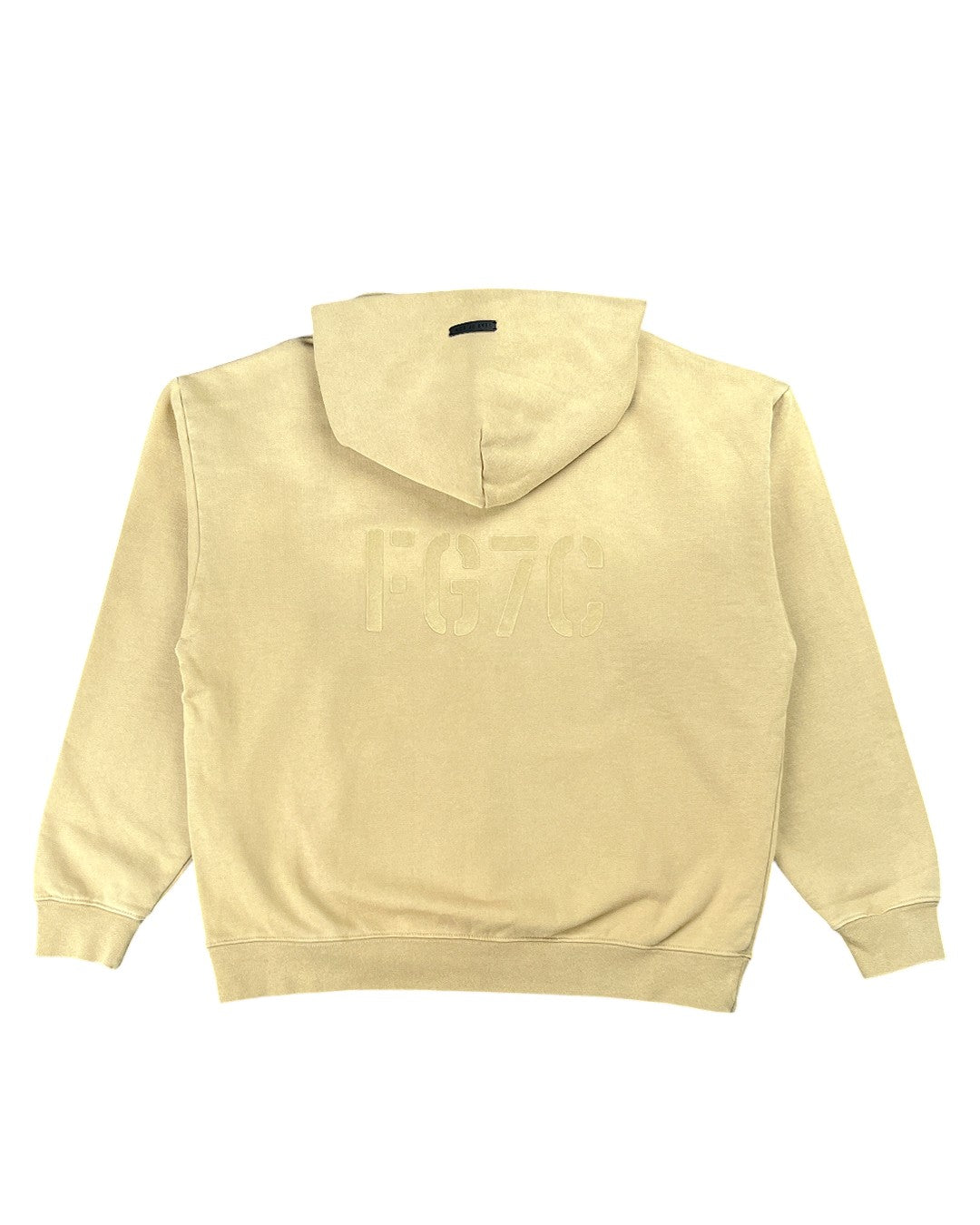 Ексклюзивно для Fear of God, лімітована серія худі FG7C, присвячена сьомій колекції. Логотип FG7C нанесений трафаретом на спині з фактурним оксамитовим флокуванням, антикварна латунна фурнітура, що надає виробу вінтажного вигляду. Виріб оброблений ребристими трикотажними манжетами та поясом з кишенею-кенгуру і шкіряною етикеткою Fear of God на капюшоні.