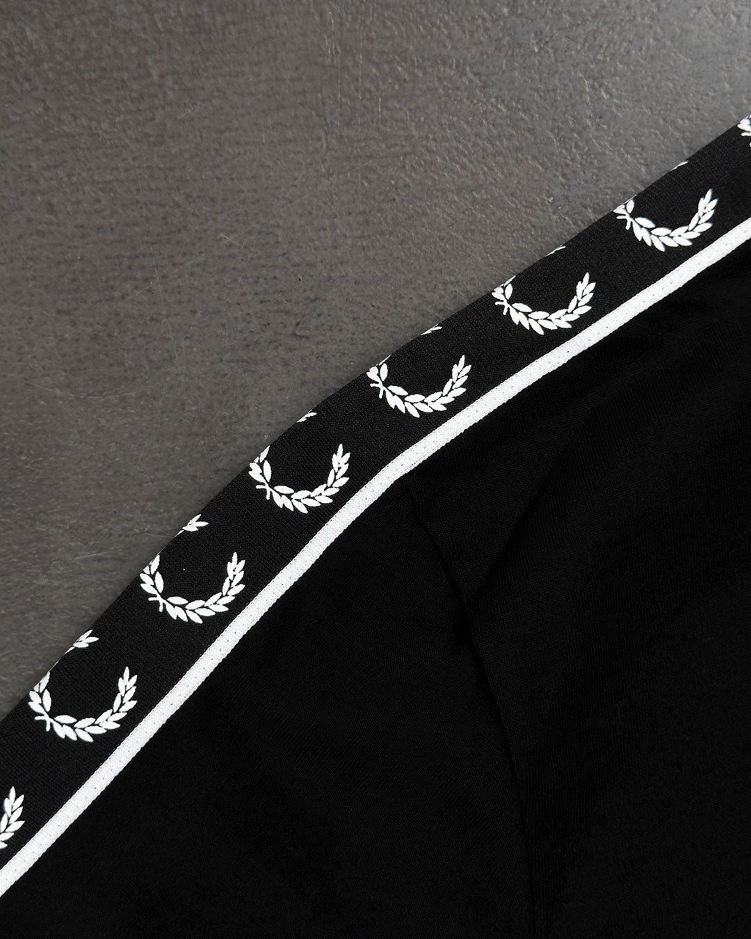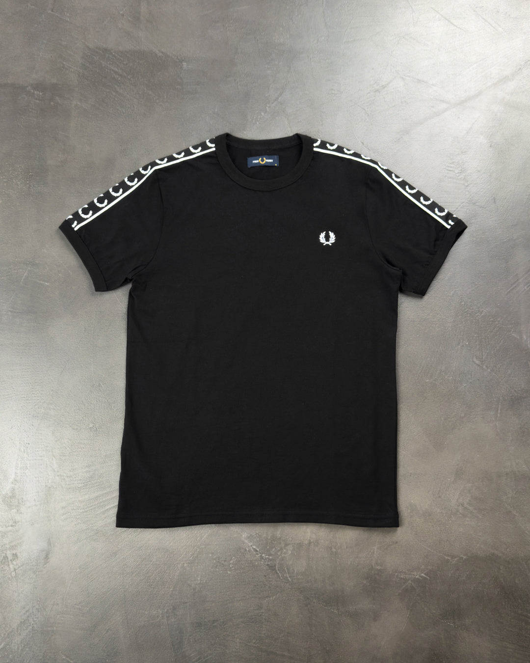 Чоловіча футболка Tape Ringer від Fred Perry - це універсальний варіант для повсякденного гардеробу. Ця футболка звичайного крою виготовлена з високоякісної бавовни для тривалого комфорту. Модель має класичний ребристий виріз горловини та короткі рукава. Оздоблена повторюваним фірмовим мотивом Fred Perry на плечах та знаковим логотипом "Лавровий вінок" на грудях.