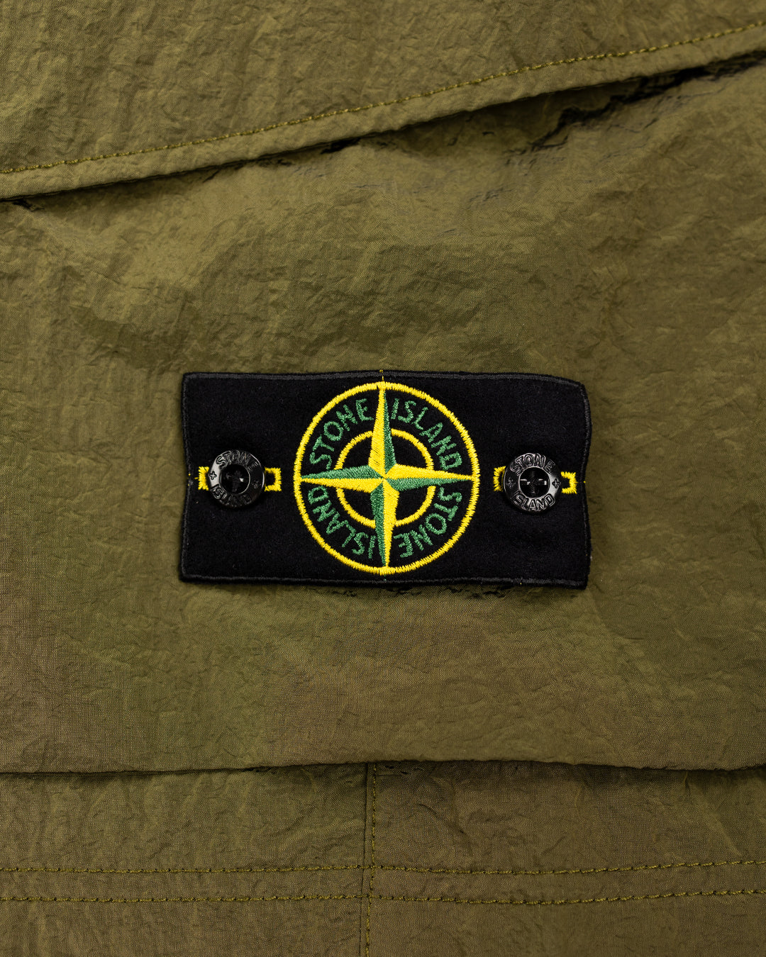 Шорти-бермуди з нової тканини Stone Island з переливчастим нейлоном Nylon Metal. Еволюція цієї культової тканини полягає у використанні регенерованої пряжі ECONYL®: відпрацьований нейлон, як до, так і після споживання, переробляється за допомогою складного процесу деполімеризації, щоб створити волокно, яке має ті ж самі властивості, що й нейлон з викопної сировини. Готовий виріб проходить складну процедуру подвійного фарбування.