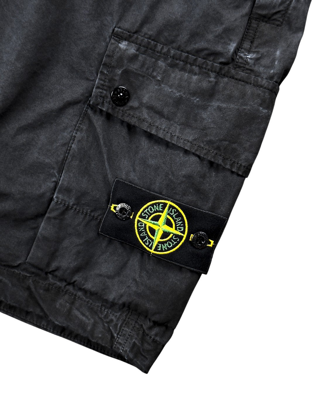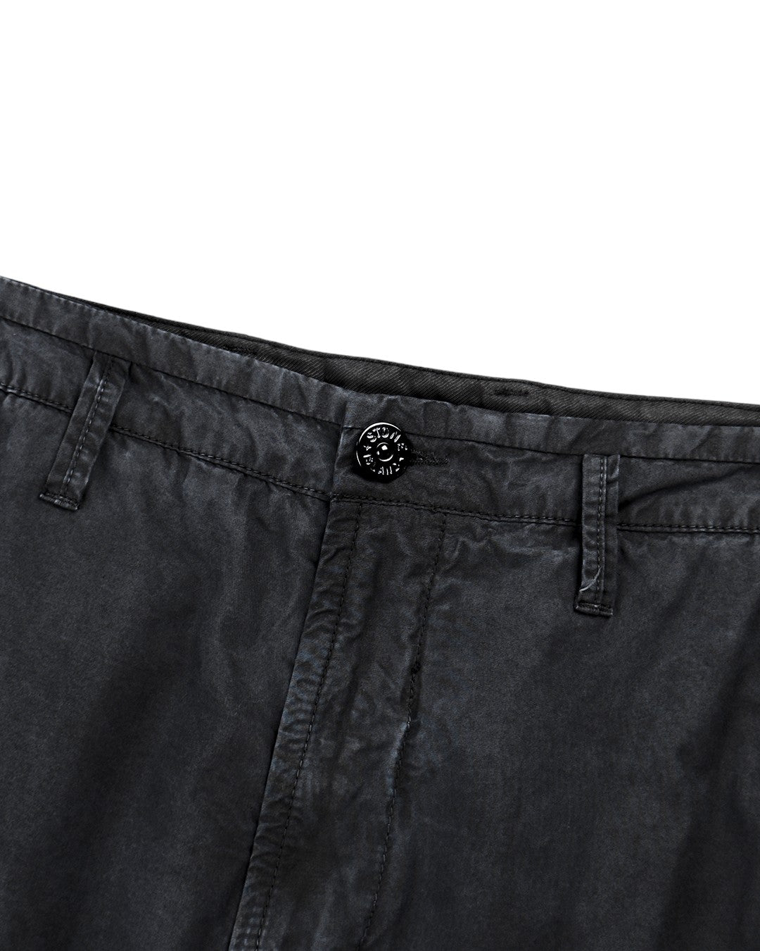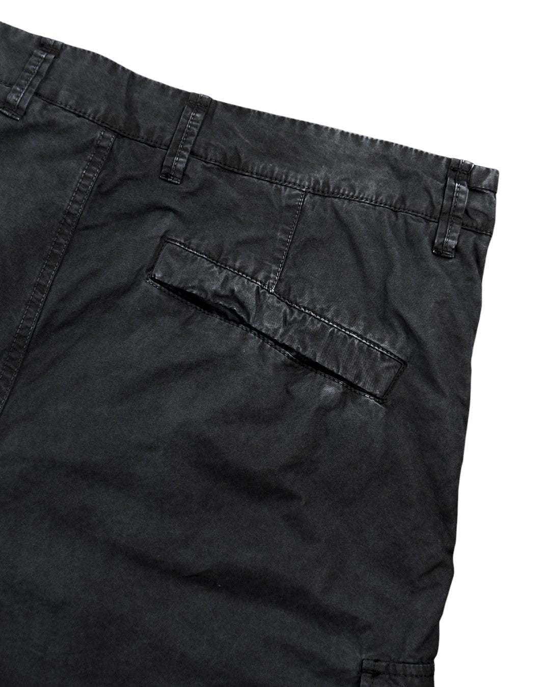Карго-бермуди з матового бавовняного полотна. Виріб пофарбований за технологією "OLD", ексклюзивною технологією фарбування з подальшим ефектом вицвітання на готовому виробі, що надає йому злегка поношеного та об'ємного вигляду. Приталений крій. Застібка на блискавку та ґудзик. Бічні кишені для рук з вітрозахисним клапаном та потайною застібкою-блискавкою. Одна задня кишеня з потайною застібкою на кнопку. По одній накладній кишені на кожній штанині з клапаном та застібкою на кнопки, ліва кишеня доповнена фірмовою нашивкою бренду.
