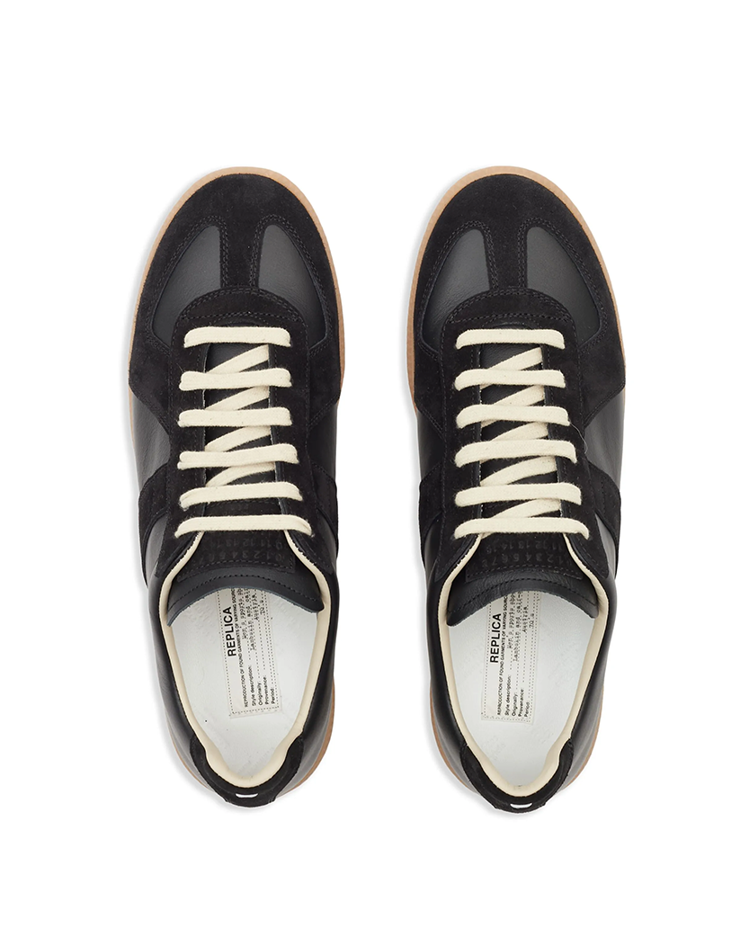 Maison Margiela Replica Sneakers — культові кросівки, натхненні австрійським спортивним взуттям 70-х років. Виготовлені з поєднання високоякісної шкіри наппа та м’якої замші, ці кросівки вирізняються мінімалістичним дизайном і винятковим комфортом. Гумова підошва забезпечує зчеплення та довговічність, а всередині — бавовняна підкладка для додаткової зручності. Завершує образ фірмова етикетка з номерами на язичку та ручне маркування моделі. Взуття поєднує ретро-естетику з сучасним баченням бренду Maison Margiela, підкреслюючи концепцію «Replica» як переосмислення класики.
