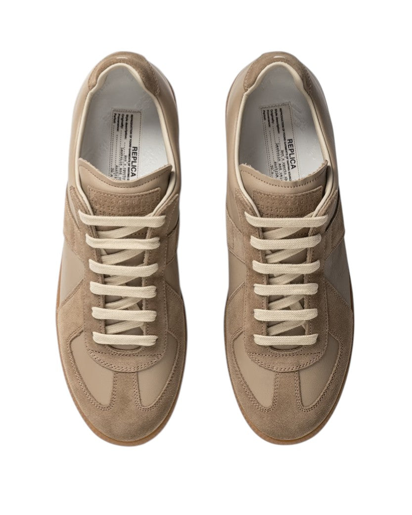 Maison Margiela Replica Sneakers — культові кросівки, натхненні австрійським спортивним взуттям 70-х років. Виготовлені з поєднання високоякісної шкіри наппа та м’якої замші, ці кросівки вирізняються мінімалістичним дизайном і винятковим комфортом. Гумова підошва забезпечує зчеплення та довговічність, а всередині — бавовняна підкладка для додаткової зручності. Завершує образ фірмова етикетка з номерами на язичку та ручне маркування моделі. Взуття поєднує ретро-естетику з сучасним баченням бренду Maison Margiela, підкреслюючи концепцію «Replica» як переосмислення класики.
