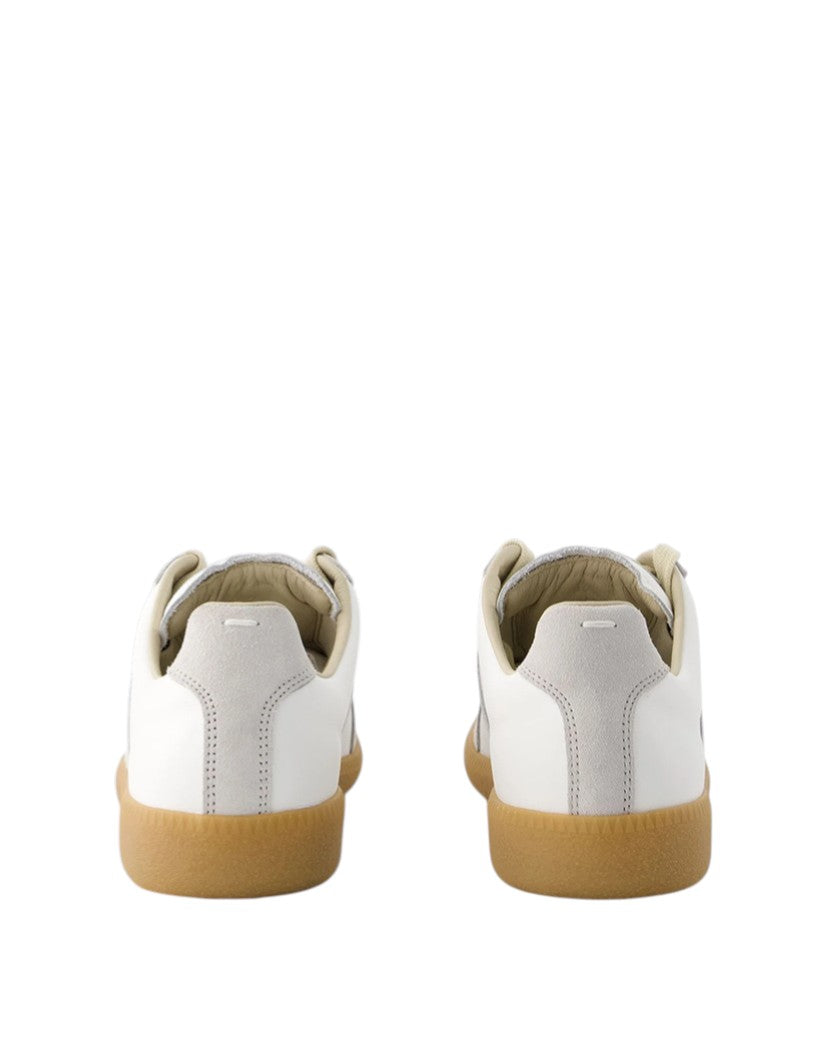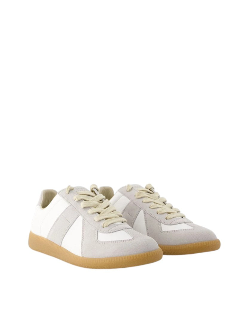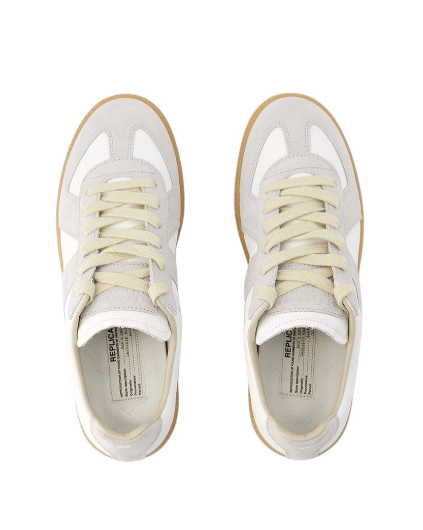 Maison Margiela Replica Sneakers — культові кросівки, натхненні австрійським спортивним взуттям 70-х років. Виготовлені з поєднання високоякісної шкіри наппа та м’якої замші, ці кросівки вирізняються мінімалістичним дизайном і винятковим комфортом. Гумова підошва забезпечує зчеплення та довговічність, а всередині — бавовняна підкладка для додаткової зручності. Завершує образ фірмова етикетка з номерами на язичку та ручне маркування моделі. Взуття поєднує ретро-естетику з сучасним баченням бренду Maison Margiela, підкреслюючи концепцію «Replica» як переосмислення класики.