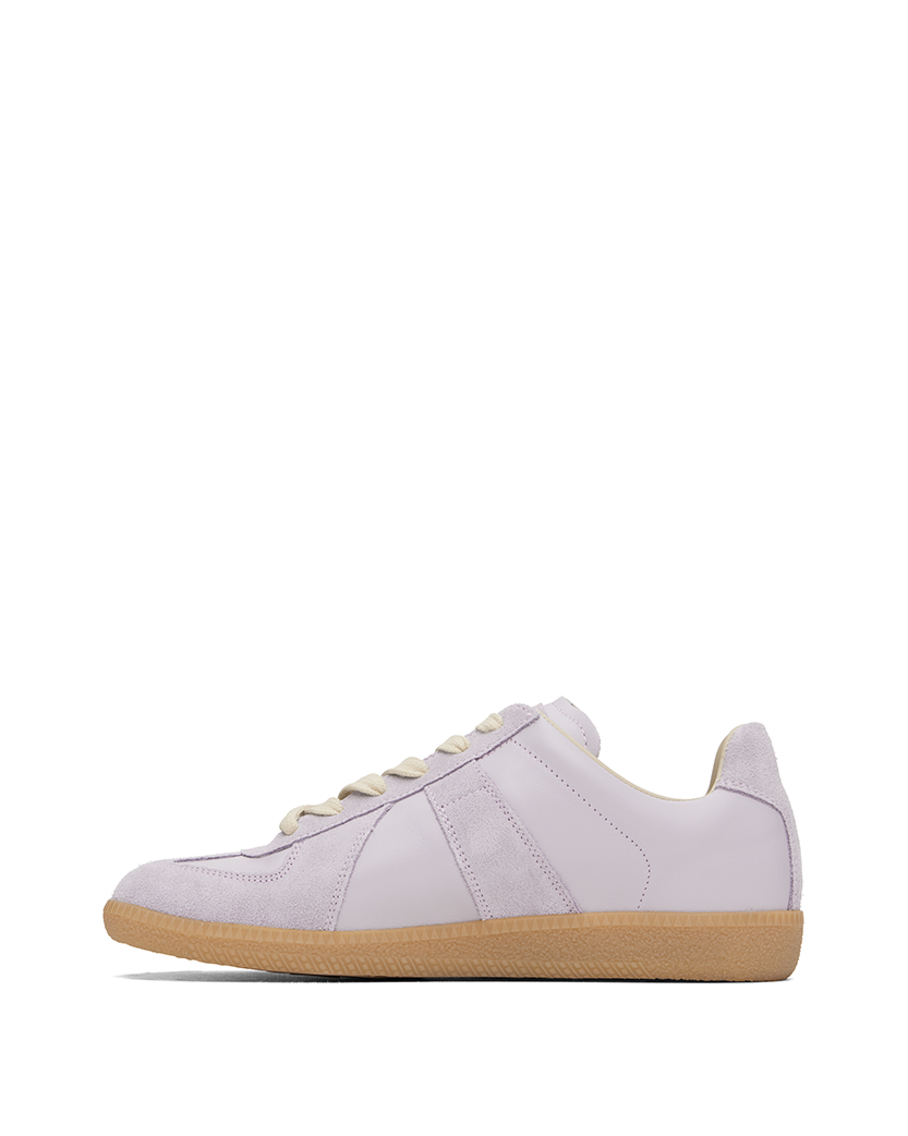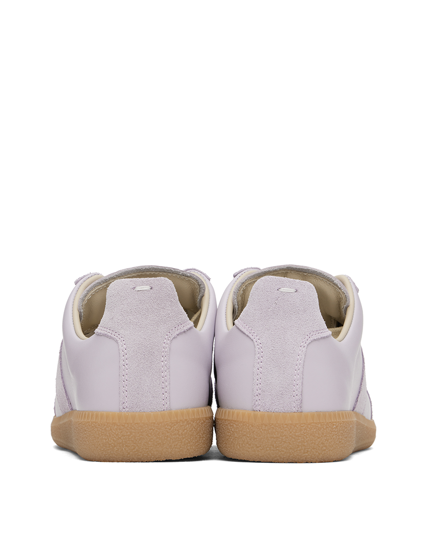 Maison Margiela Replica Sneakers — культові кросівки, натхненні австрійським спортивним взуттям 70-х років. Виготовлені з поєднання високоякісної шкіри наппа та м’якої замші, ці кросівки вирізняються мінімалістичним дизайном і винятковим комфортом. Гумова підошва забезпечує зчеплення та довговічність, а всередині — бавовняна підкладка для додаткової зручності. Завершує образ фірмова етикетка з номерами на язичку та ручне маркування моделі. Взуття поєднує ретро-естетику з сучасним баченням бренду Maison Margiela, підкреслюючи концепцію «Replica» як переосмислення класики.