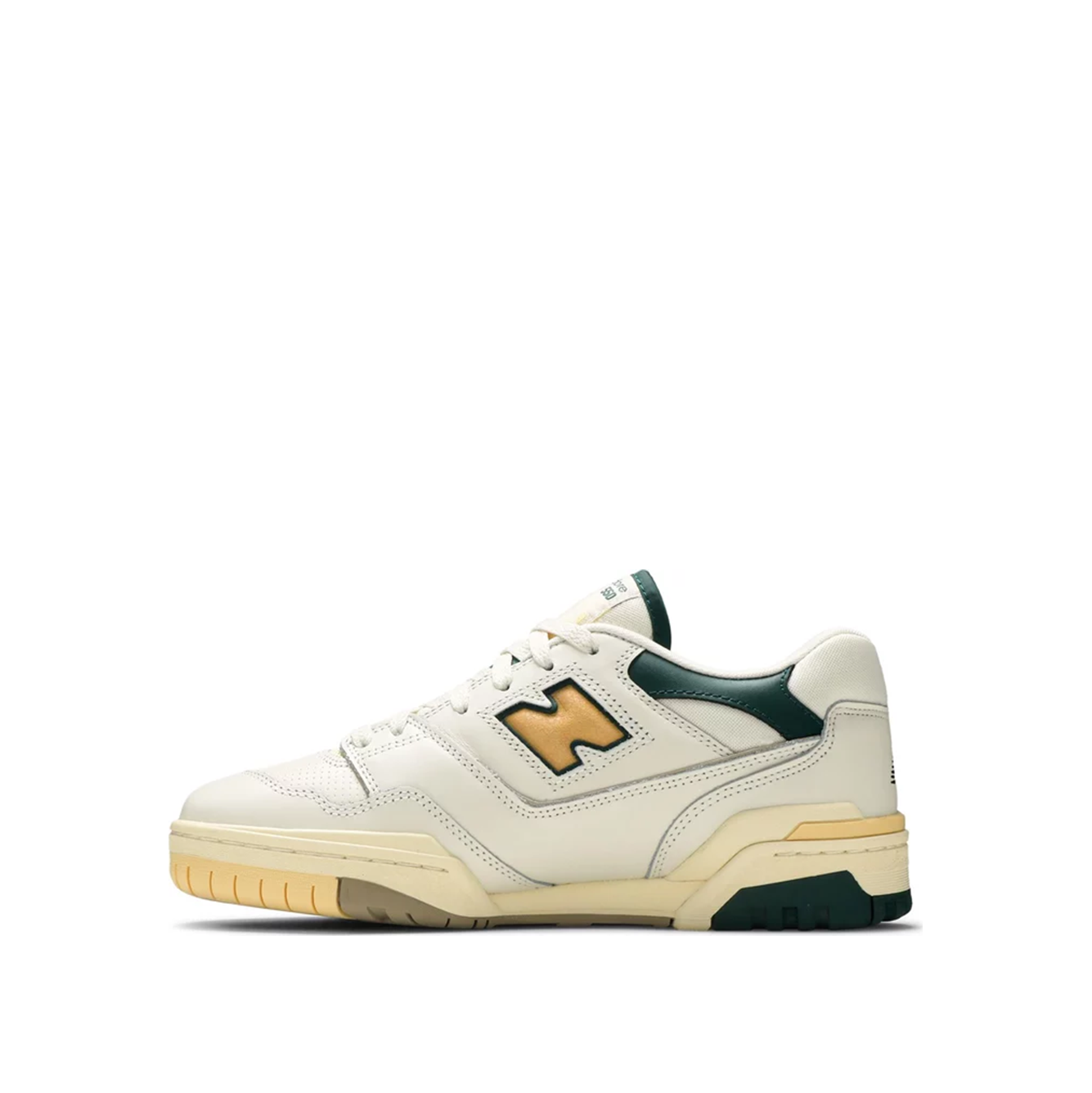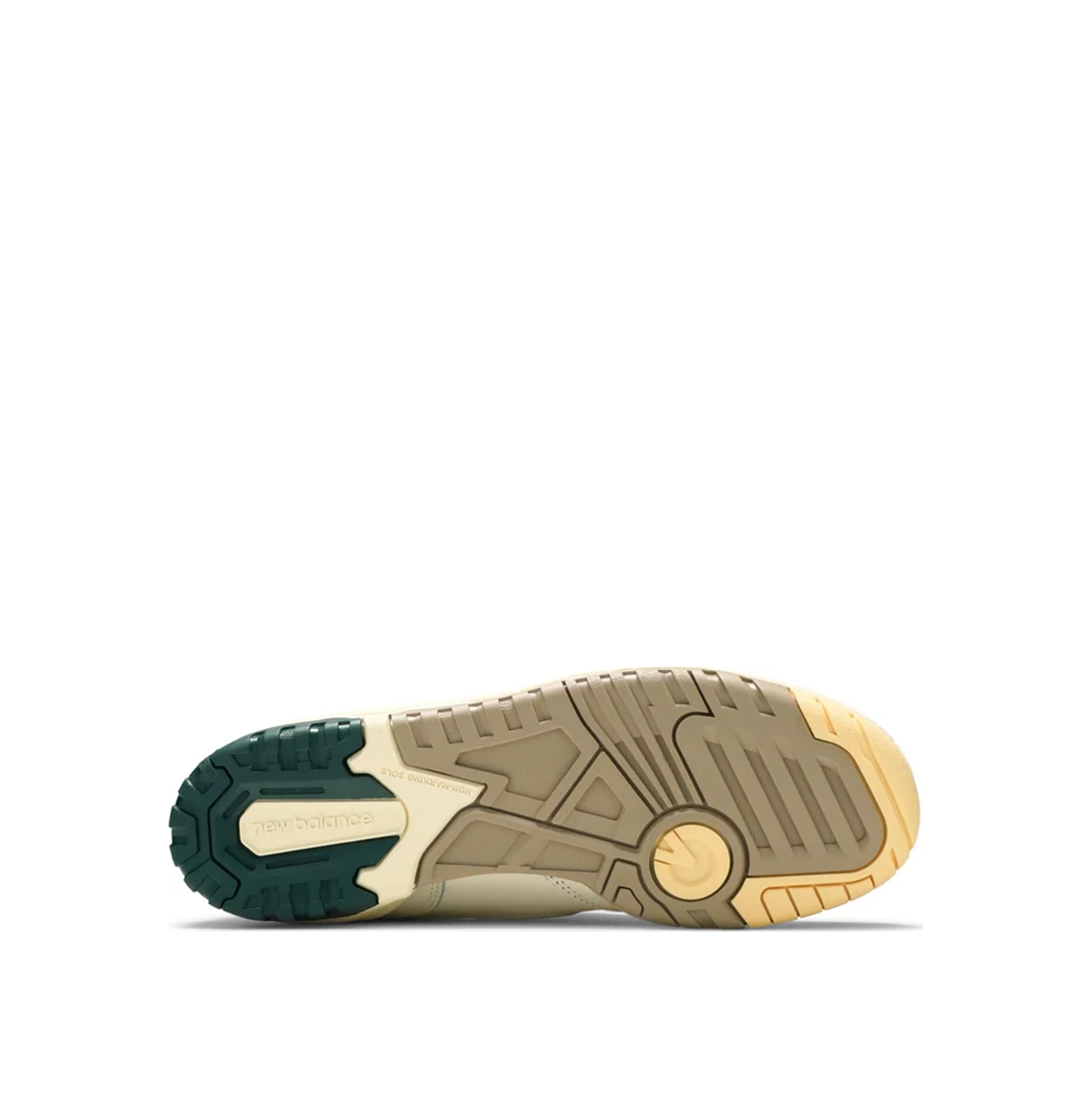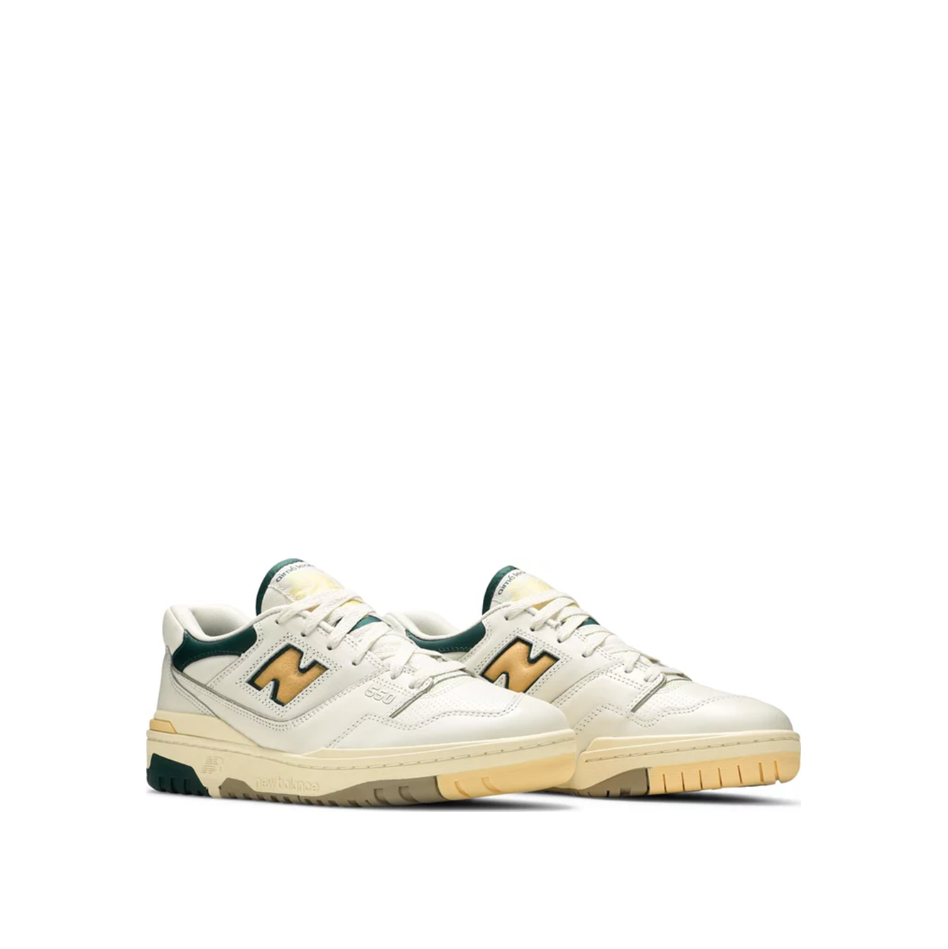Модель New Balance 550 x Aimé Leon Dore Green Yellow взята з великої капсульної колекції, розробленої у партнерстві з нью-йоркським лейблом чоловічого одягу. Знову представлені публіці Еме Леоном Доре у 2020 році, кросівки-обручі кінця 80-х повертаються менш ніж через рік у традиційному виконанні з білої шкіри з контрастними зеленими та жовтими акцентами. До стандартного брендингу New Balance додаються логотипи ALD на лівій п'яті та обидва ткані язички. Попередньо пожовкла підошва підкреслює вінтажний вигляд кросівок.