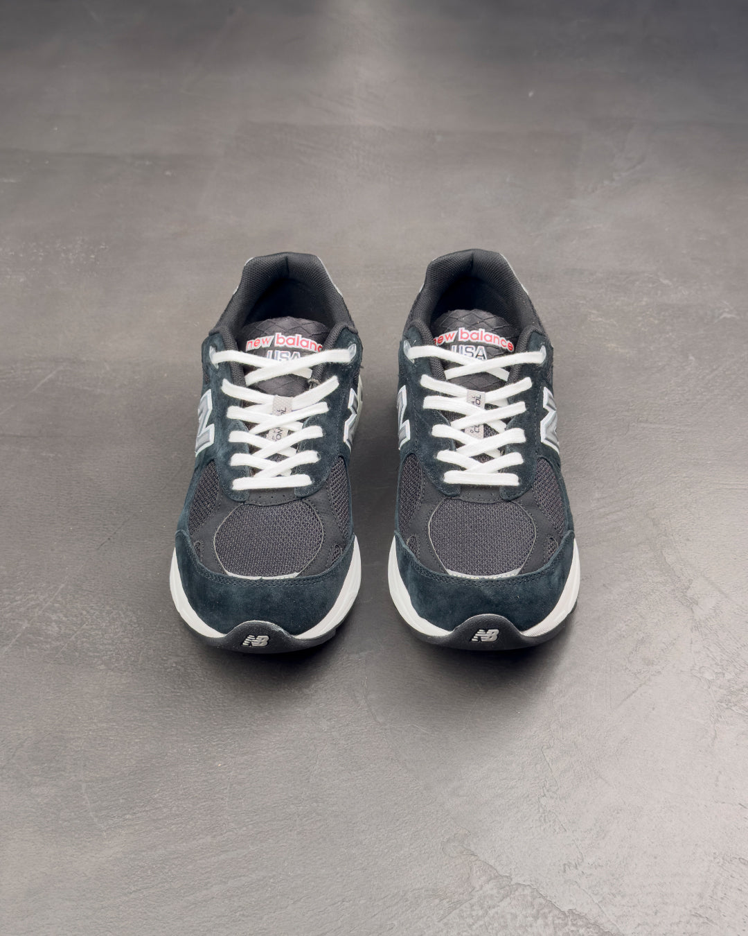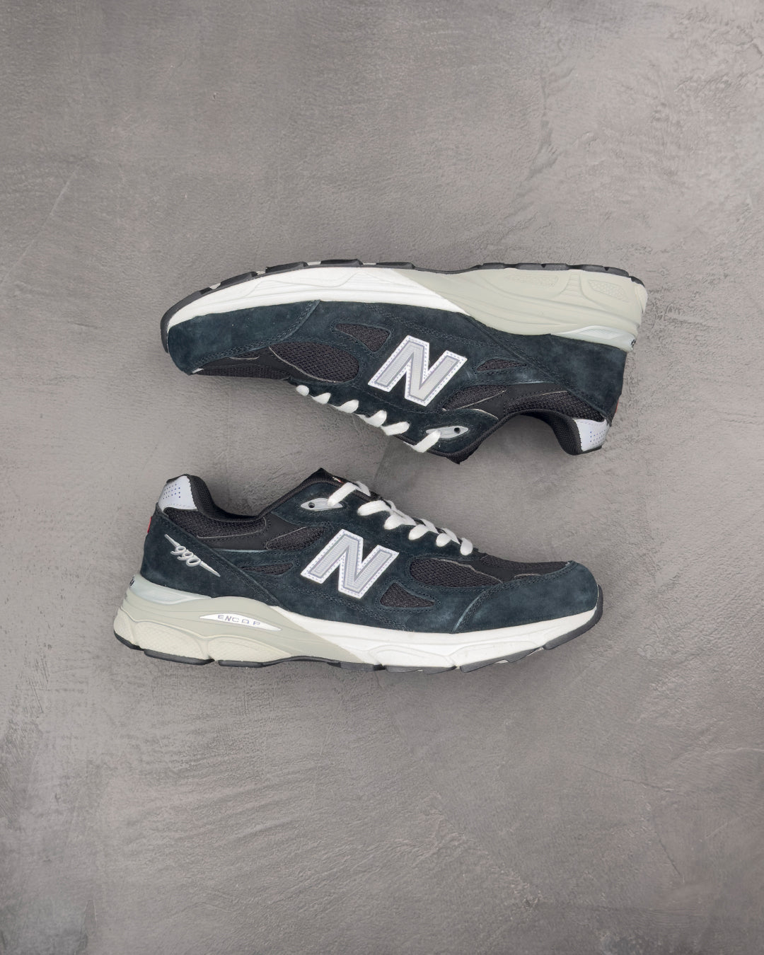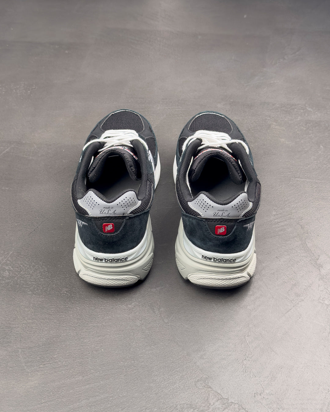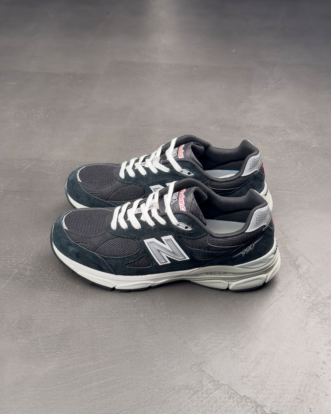 New Balance 990 V3 Black демонструє традиційну конструкцію з сітки та замші зі шкіри на кросівках для активного способу життя, які були випущені в 2012 році. Монохромне чорне покриття кросівок порушується світловідбиваючими сірими акцентами на логотипі "N" та п'ятковій накладці зі штучної шкіри з написом "Made in USA". На язичку вибито контрастний червоний напис "New Balance". Легку амортизацію забезпечує проміжна підошва ENCAP, що складається з м'якої піни та міцного поліуретанового наповнювача.