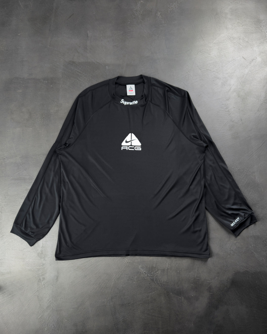 Колаборація між Nike ACG та Supreme. Лонгслів виготовлений з поліестеру, що має вологовідвідні властивості. Прикрашений логотипами обох брендів.