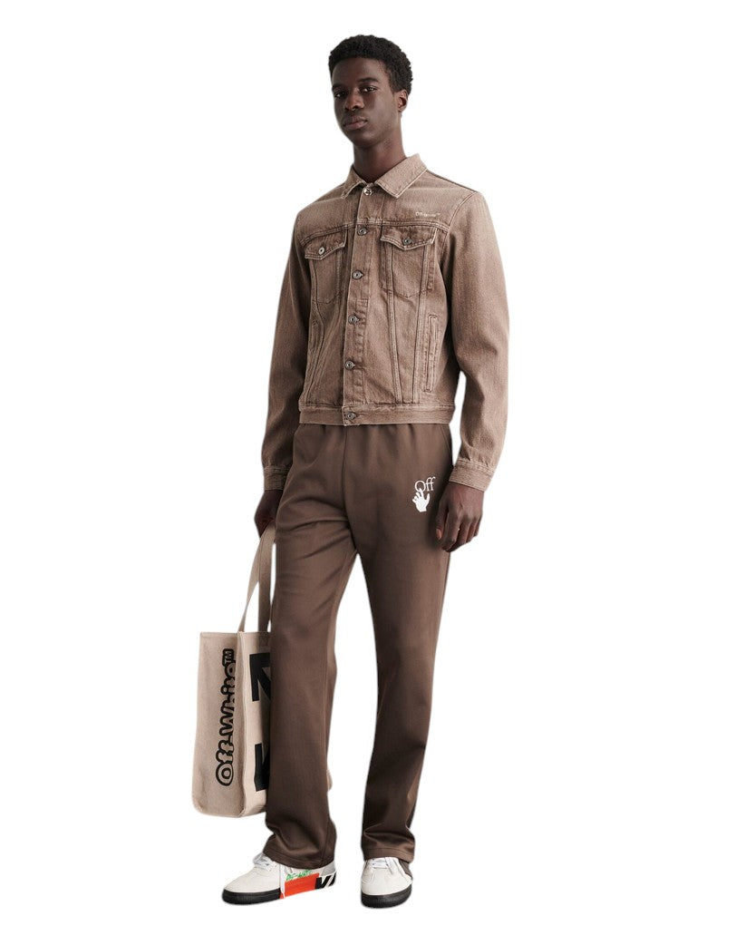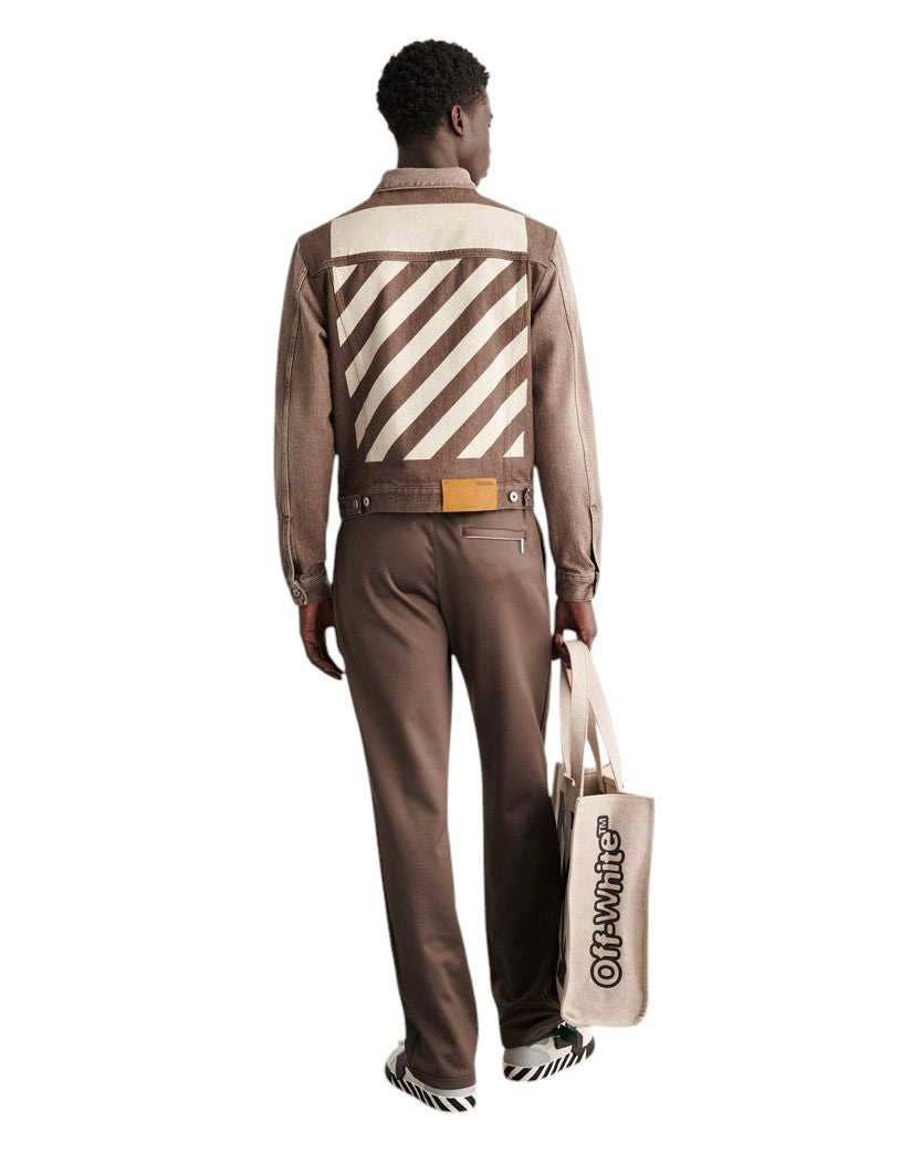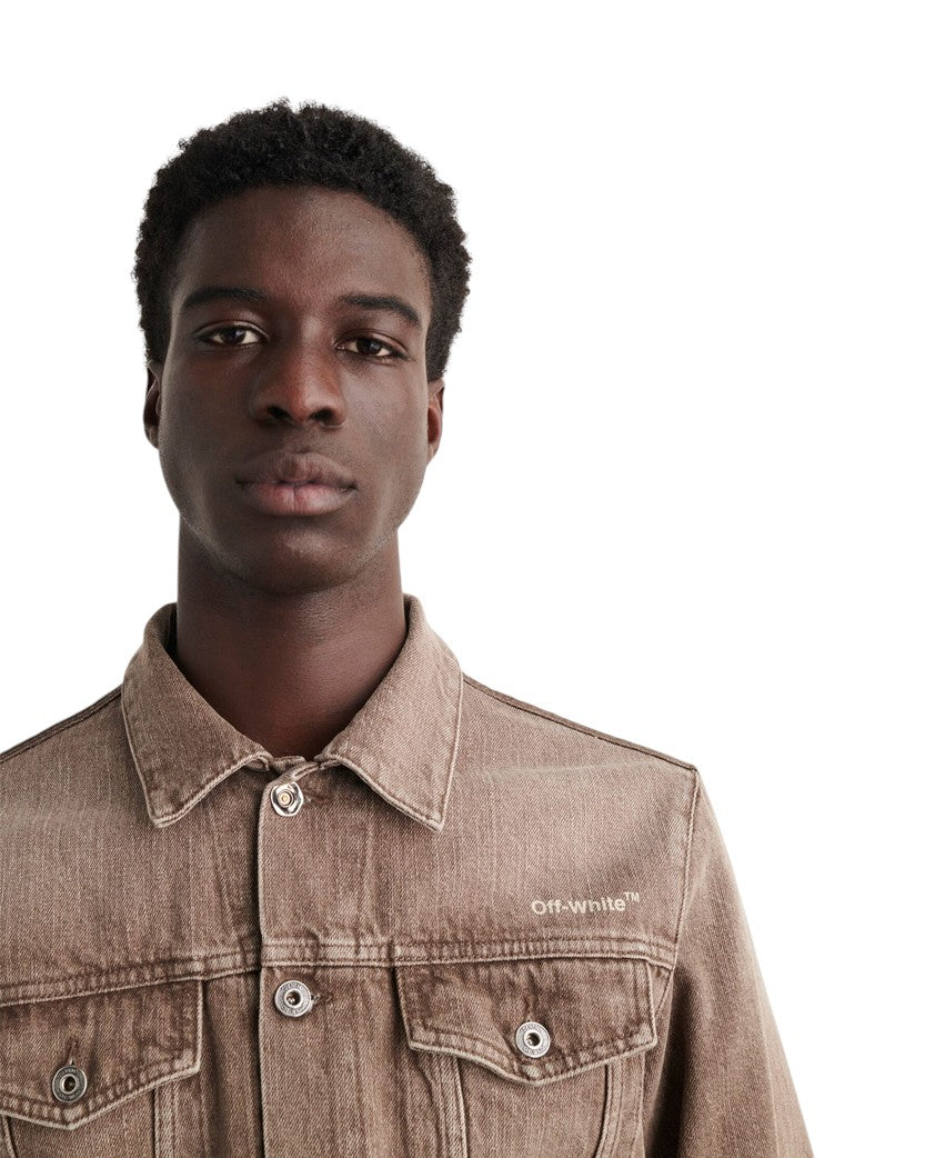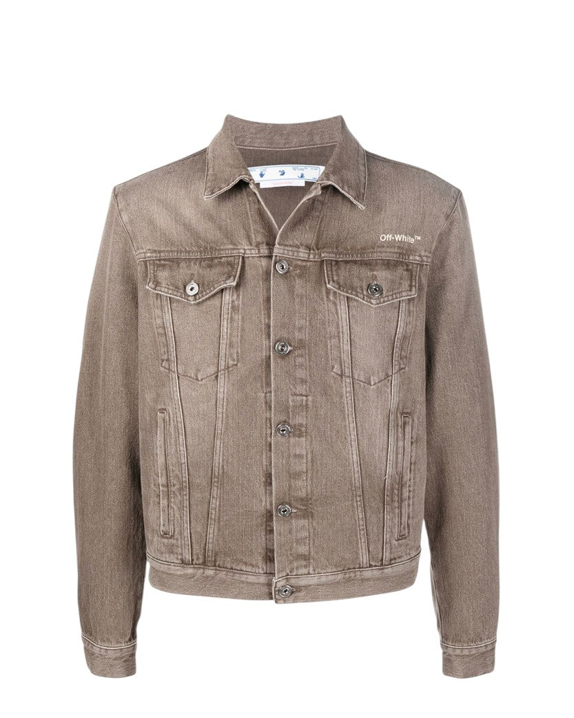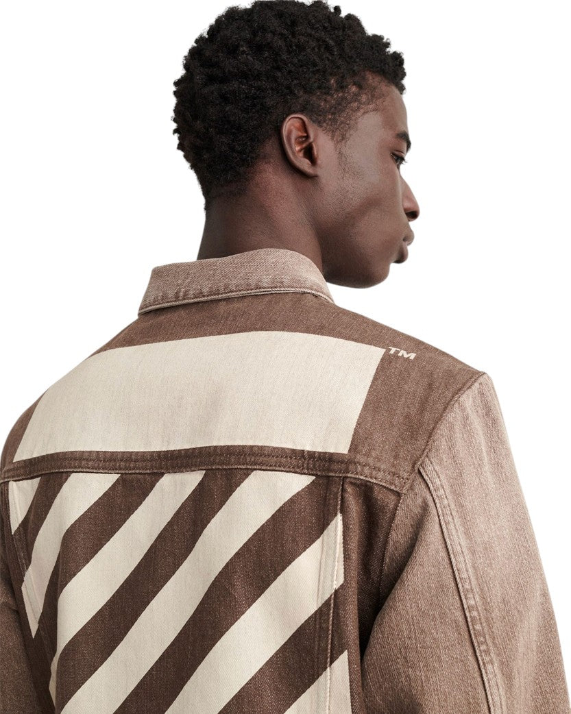 Джинсова куртка від Off-White виготовлена з бавовняного матеріалу з ефектом потертості. Застібка на ґудзиках спереду, класичний комір, довгі рукава, нагрудні кишені та манжети на ґудзиках, дві бічні кишені. Куртка прикрашена принтом з діагональними смугами на спині та логотипом спереду.