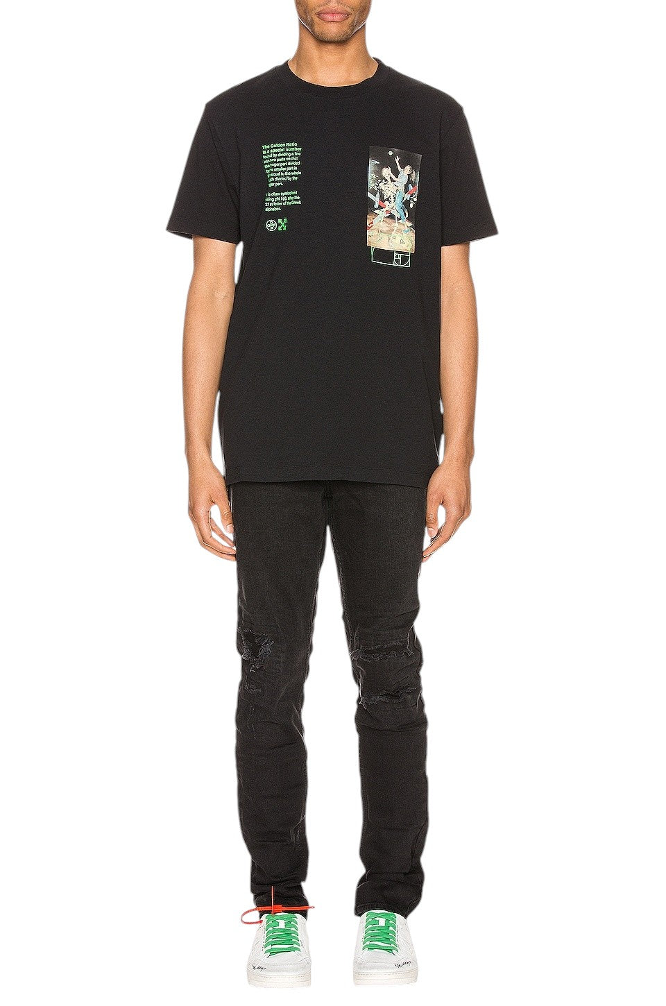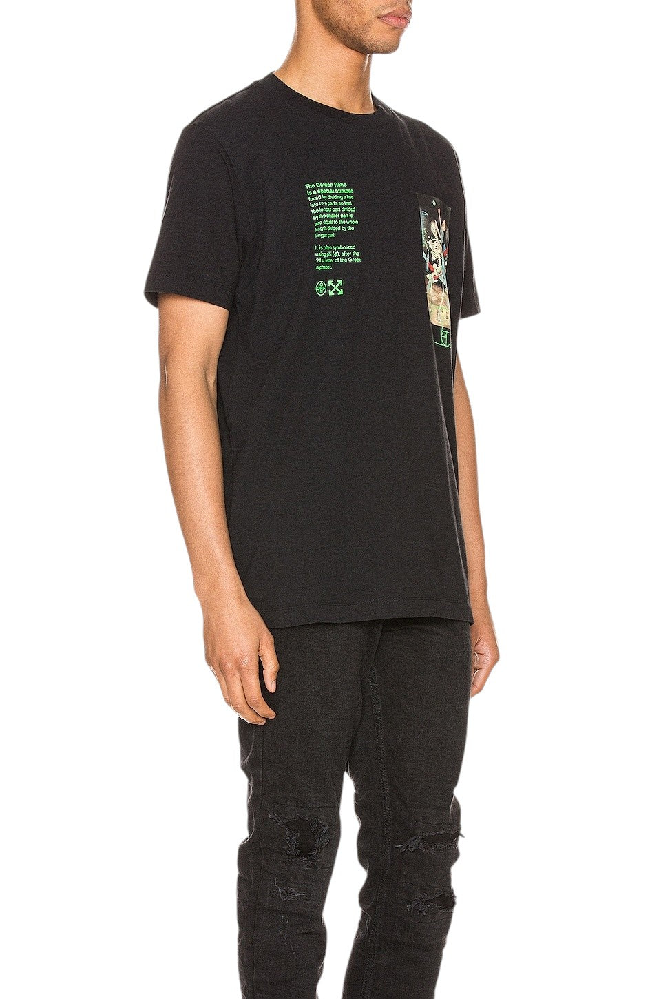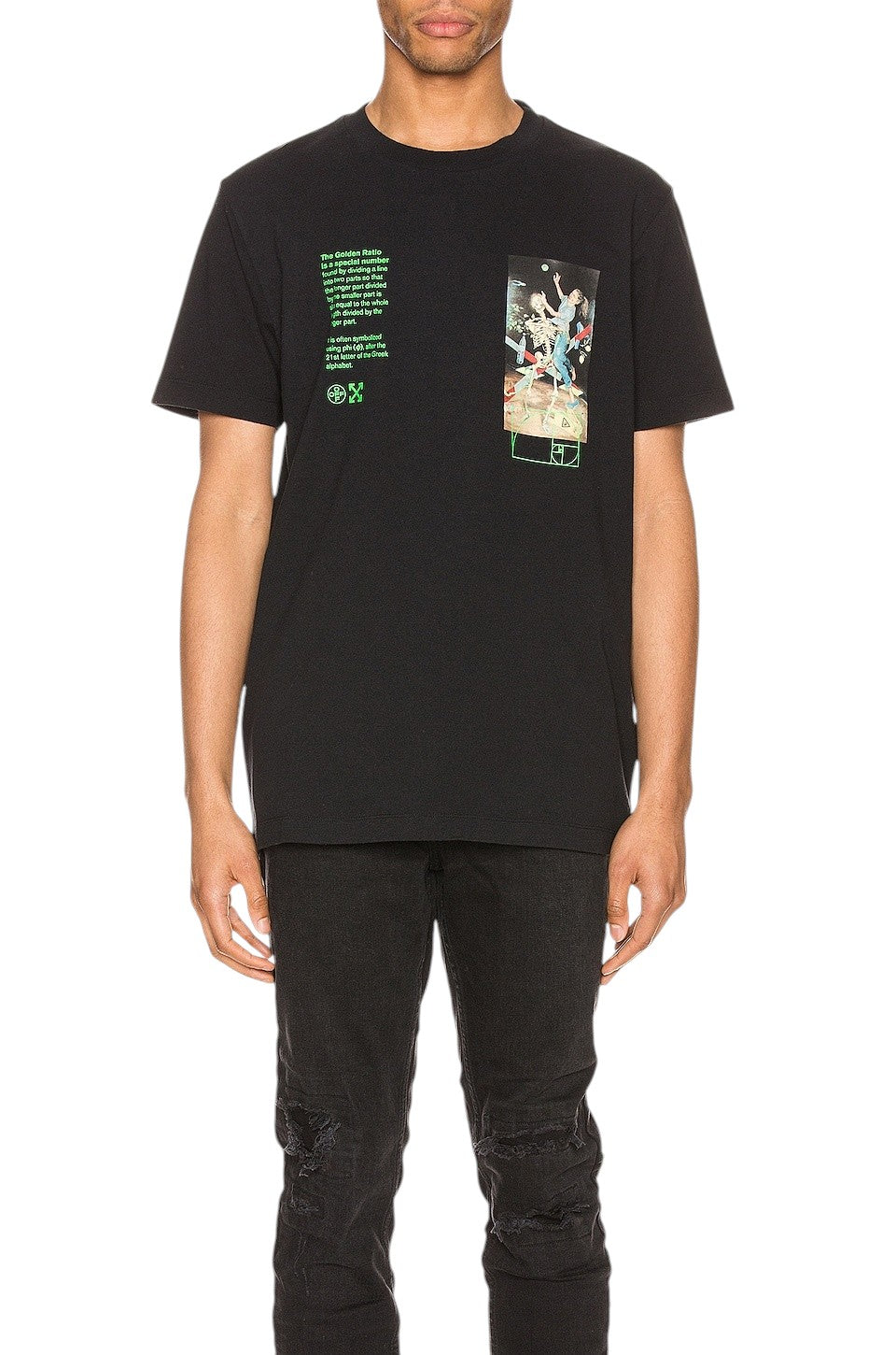 Сюрреалістична модель SS20 з ребристим коміром та прикрашена неоновим зеленим написом "Golden Ratio" спереду та ззаду. Малюнок від Off-White зображує дівчину в культовому індустріальному поясі бренду, яка бореться зі скелетом на грудях цієї футболки.
