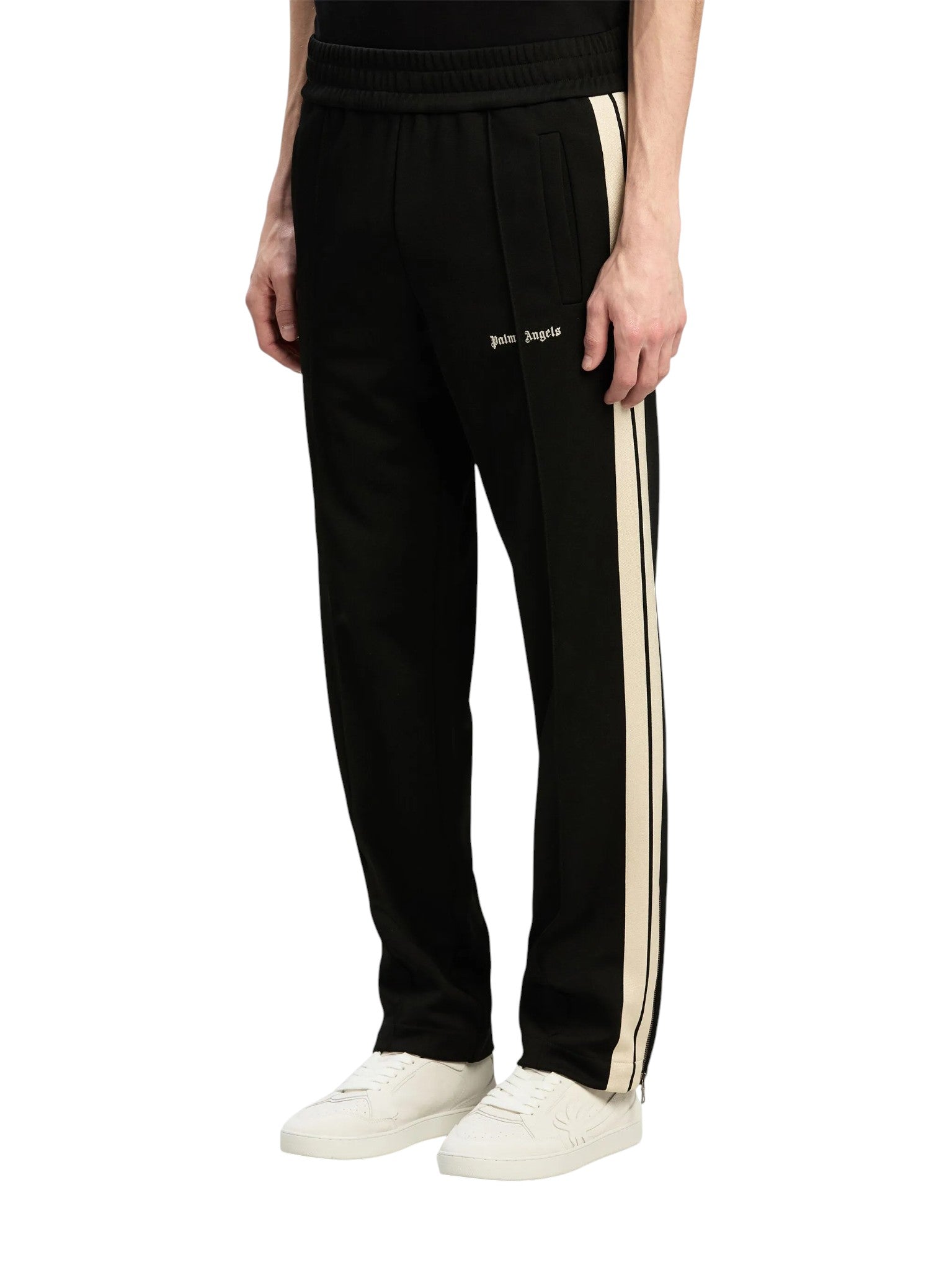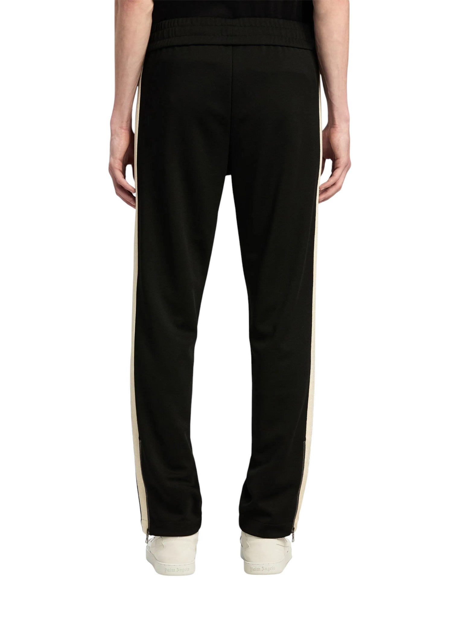 Palm Angels Track Pants — це спортивні штани з поліестеру, що поєднують комфорт і вуличну естетику бренду. Модель має прямий крій і середню посадку на талії, доповнену еластичним поясом для зручної фіксації. Шов спереду на штанинах надає структурності силуету, а застібки-блискавки на манжетах дозволяють регулювати ширину низу. Уздовж зовнішніх швів проходить чорно-біла трикотажна смуга, що підкреслює спортивний характер виробу. На передній частині штанини розташовано білий логотип Palm Angels.