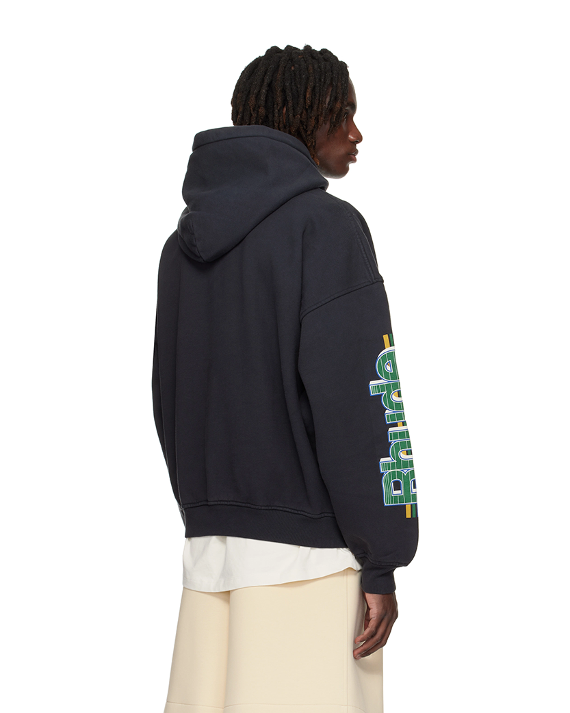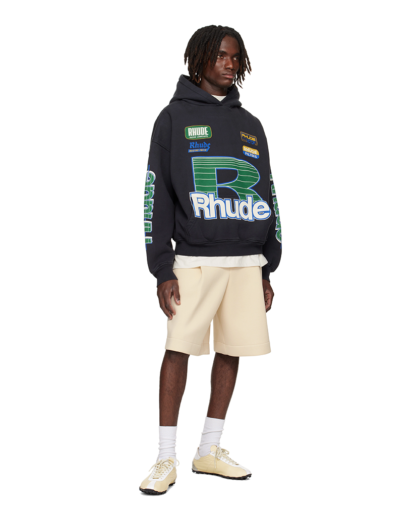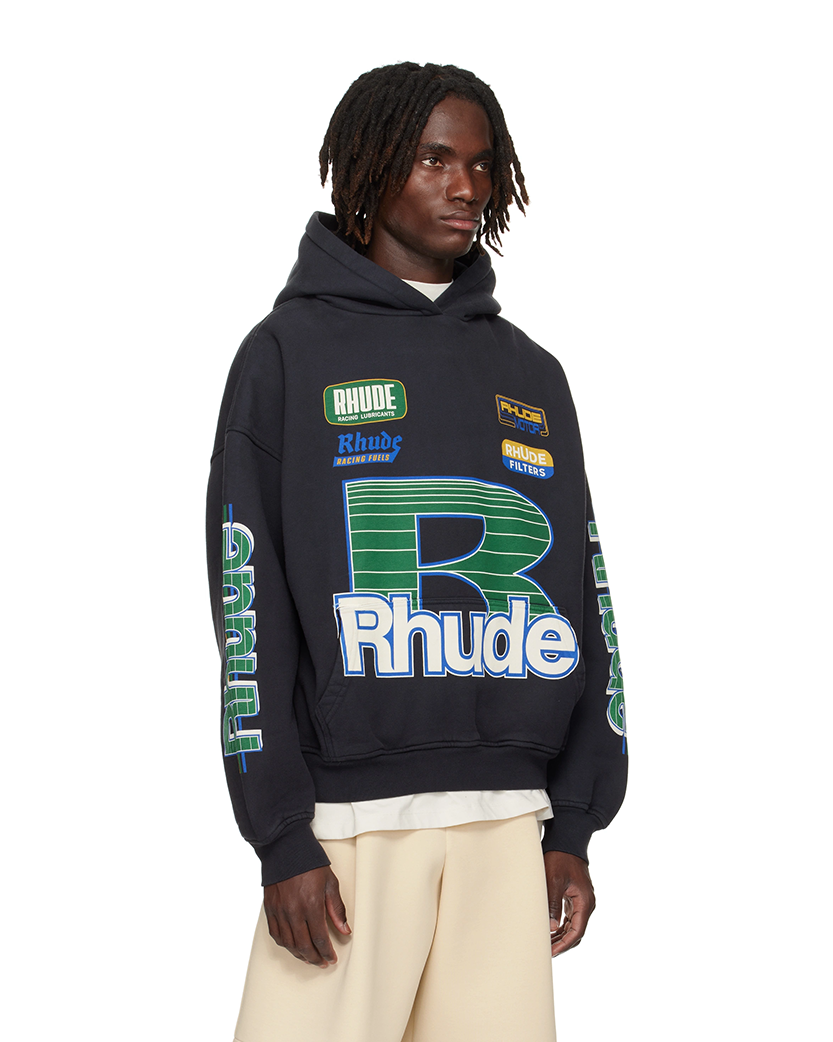 Худі має класичний крій з капюшоном, кишенею-кенгуру, ребристими манжетами та нижнім краєм для комфортної посадки. Графічні принти у стилі автоспорту, натхненні дорожніми перегонами, розміщені спереду та на рукавах, створюють динамічний візуальний акцент і підкреслюють впізнавану айдентику Rhude.