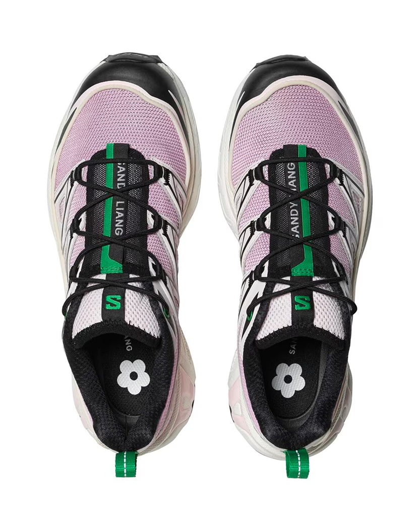 Sandy Liang, миттєво впізнавана завдяки своїм химерним творінням, що часто рясніють квітковими та барвистими палітрами, зробила собі ім'я завдяки своєму безкомпромісному ексцентричному дизайну. Ця співпраця з Salomon не стала винятком, і нью-йоркська дизайнерка надихається бабусями з Чайна-тауна, надихаючись найкрутішими людьми похилого віку з Даунтауна та їхнім безтурботним підходом до вбрання. Дует повертається до моделі XT-6, використовуючи ту саму технологію, але рожевого кольору, використовуючи любов Лян до мультфільмів та їхніх пастельних тонів. Ностальгічні рожево-зелені кольори, натхненні улюбленими персонажами покемонів, вперше з'явилися на кросівках з надійним силуетом стежки, дихаюча і легка синтетична сітка підкреслена квітковим принтом в стилі аніме, створюючи сучасну версію класичної моделі для активного відпочинку.