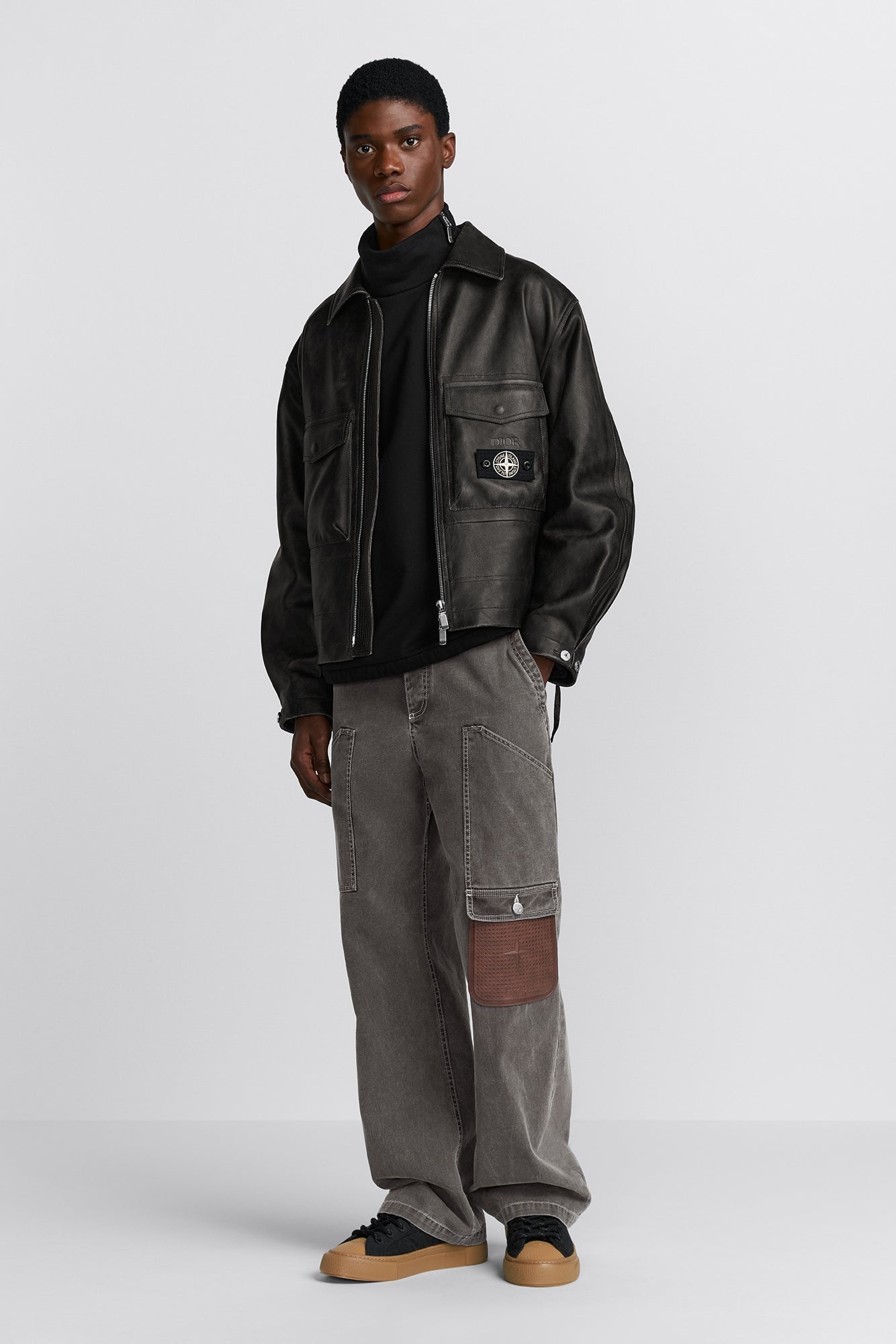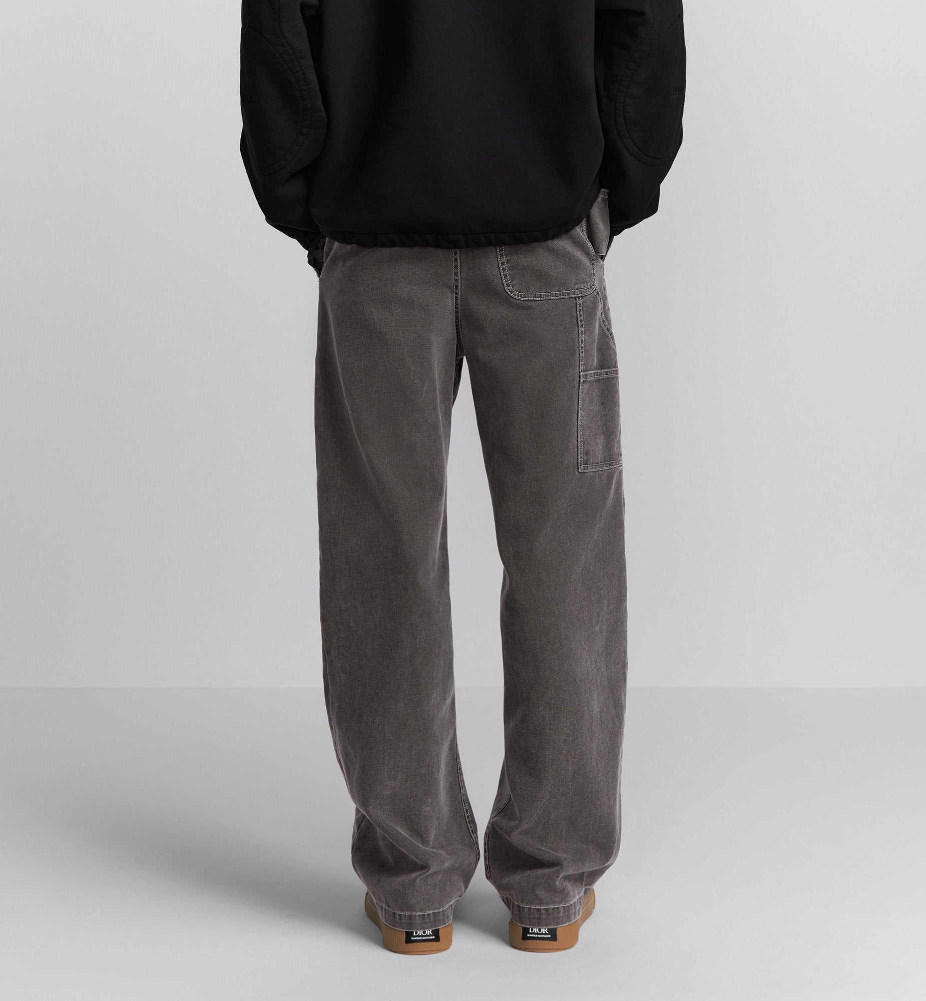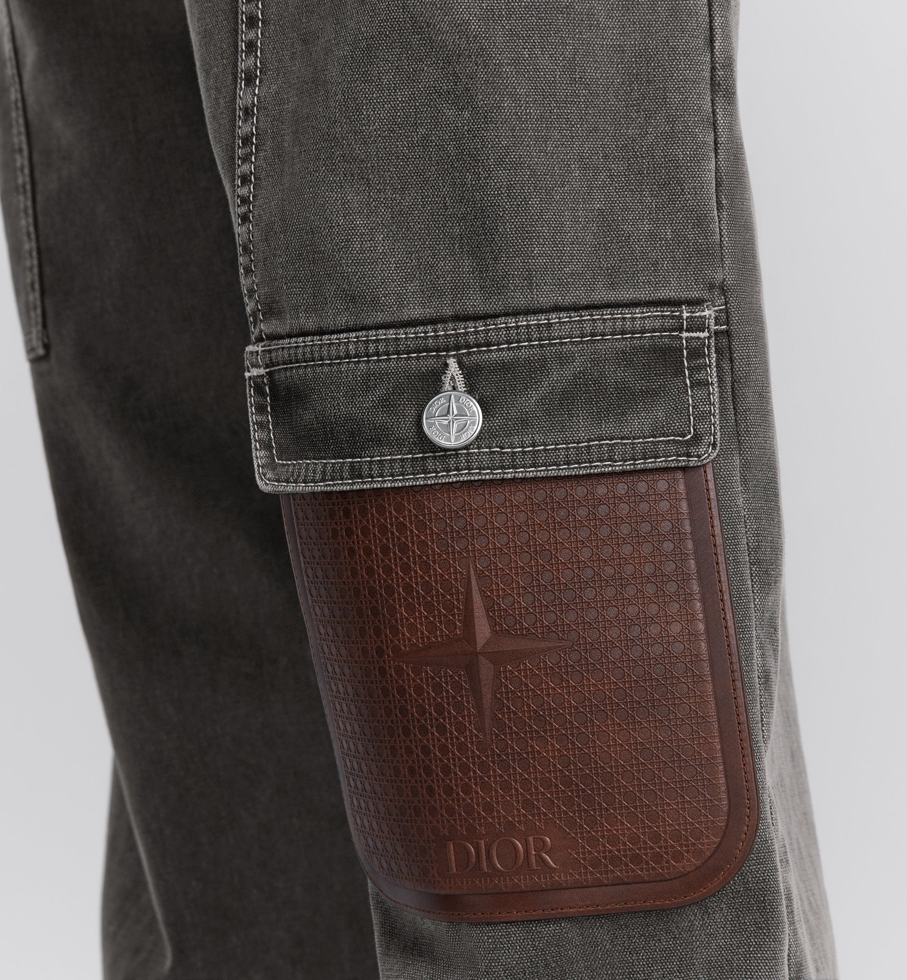 Джинси, що є частиною капсули Stone Island x Dior, демонструють підпис колаборації, підкреслюючи знакову зірку Stone Island, доповнену підписом Будинку. Виготовлені з чорного бавовняного полотна. На передніх штанинах розташовані великі вертикальні прямокутні накладні кишені, а також квадратна шкіряна кишеня з клапаном та логотипом Stone Island x Dior. Задня накладна кишеня та велика теслярська петля з правого боку.
