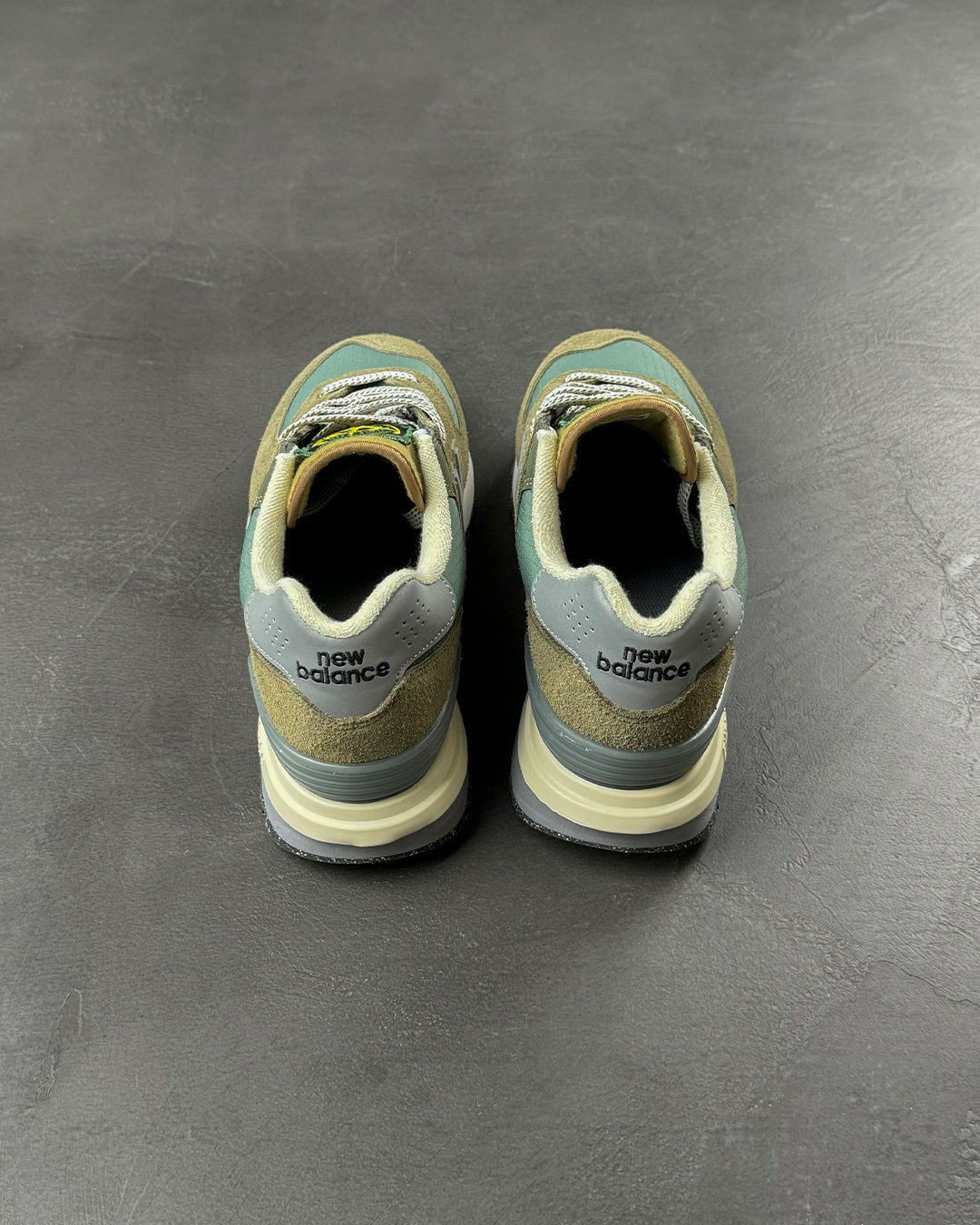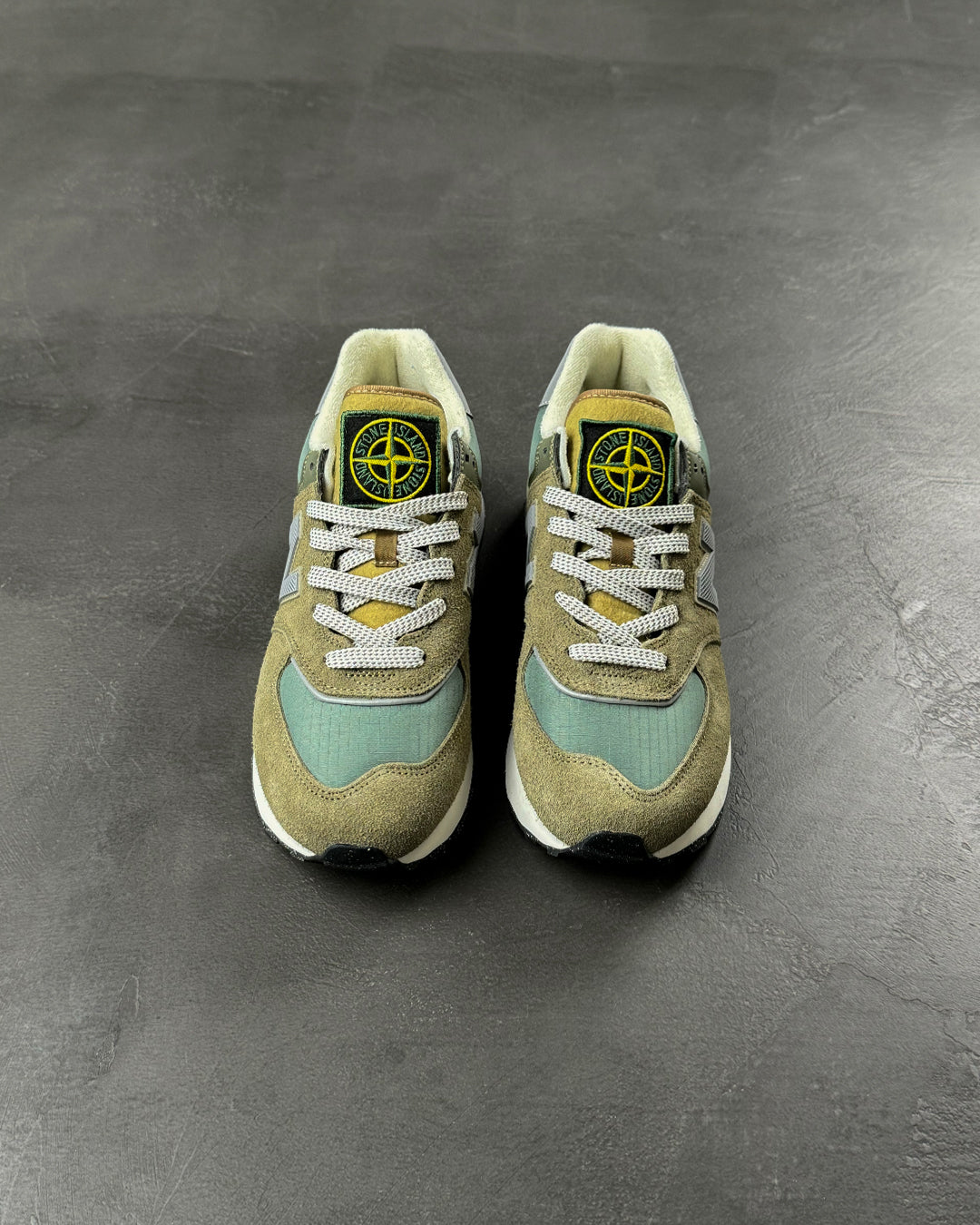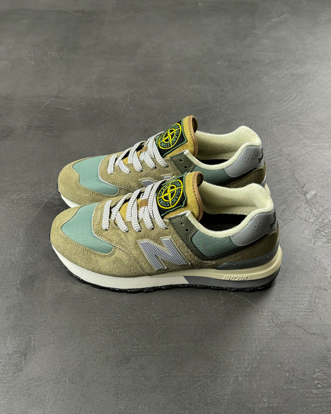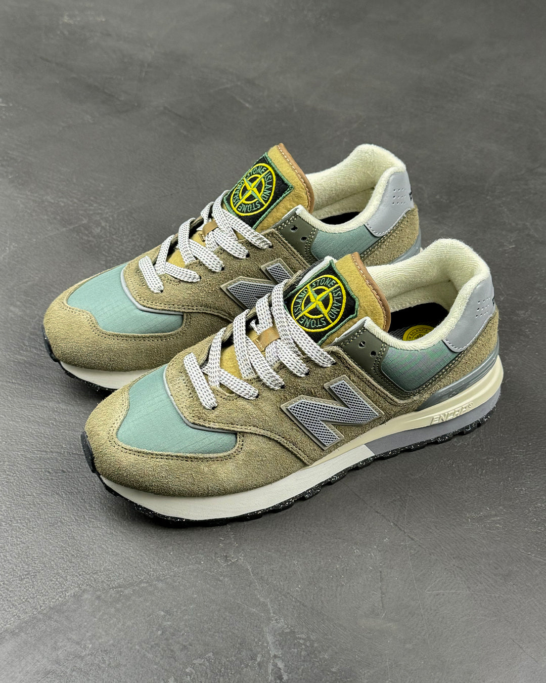 Stone Island та New Balance знову об'єдналися, щоб представити нову колекцію - кросівки 574. Відійшовши від футбольної тематики, бренди надали кросівкам естетики мілітарі-стилю завдяки замшевим накладкам зеленого кольору, сітчастій багатошаровій сітці та сріблястим деталям. На язичку кросівок розміщено нашивку з компасом Stone Island, а знакова літера "N" від New Balance - як завжди, збоку взуття.