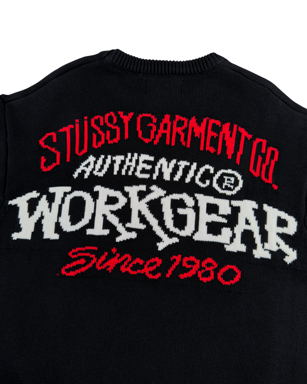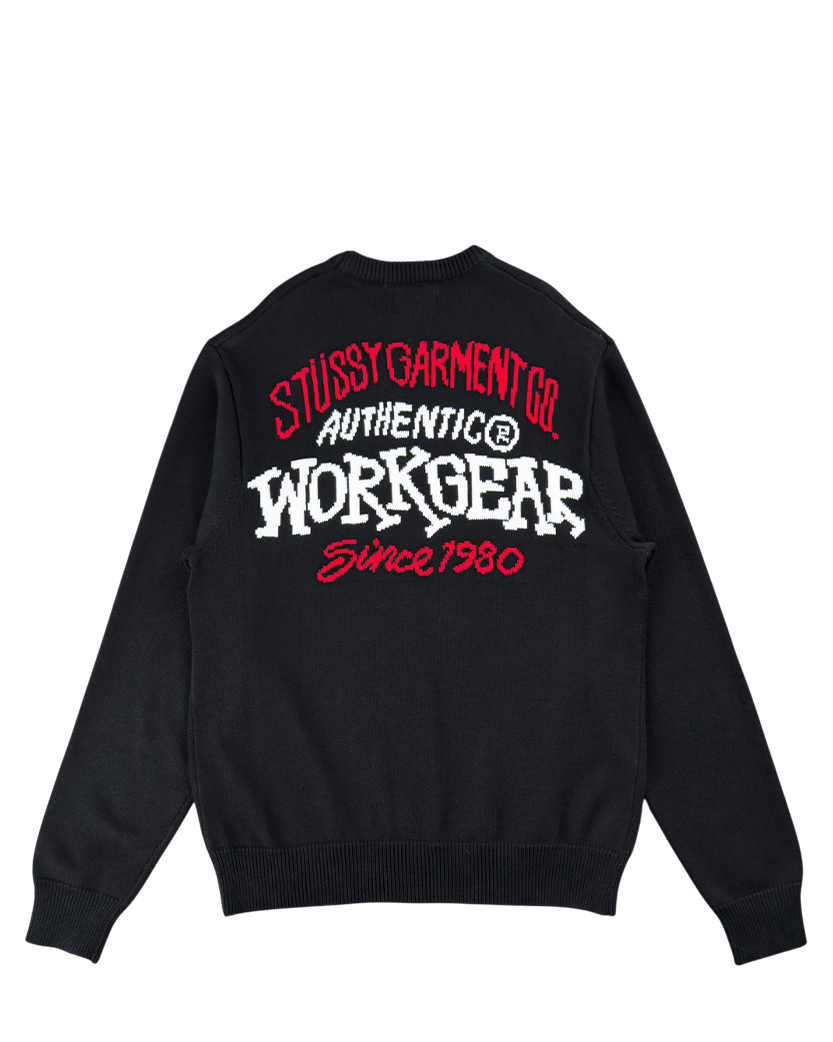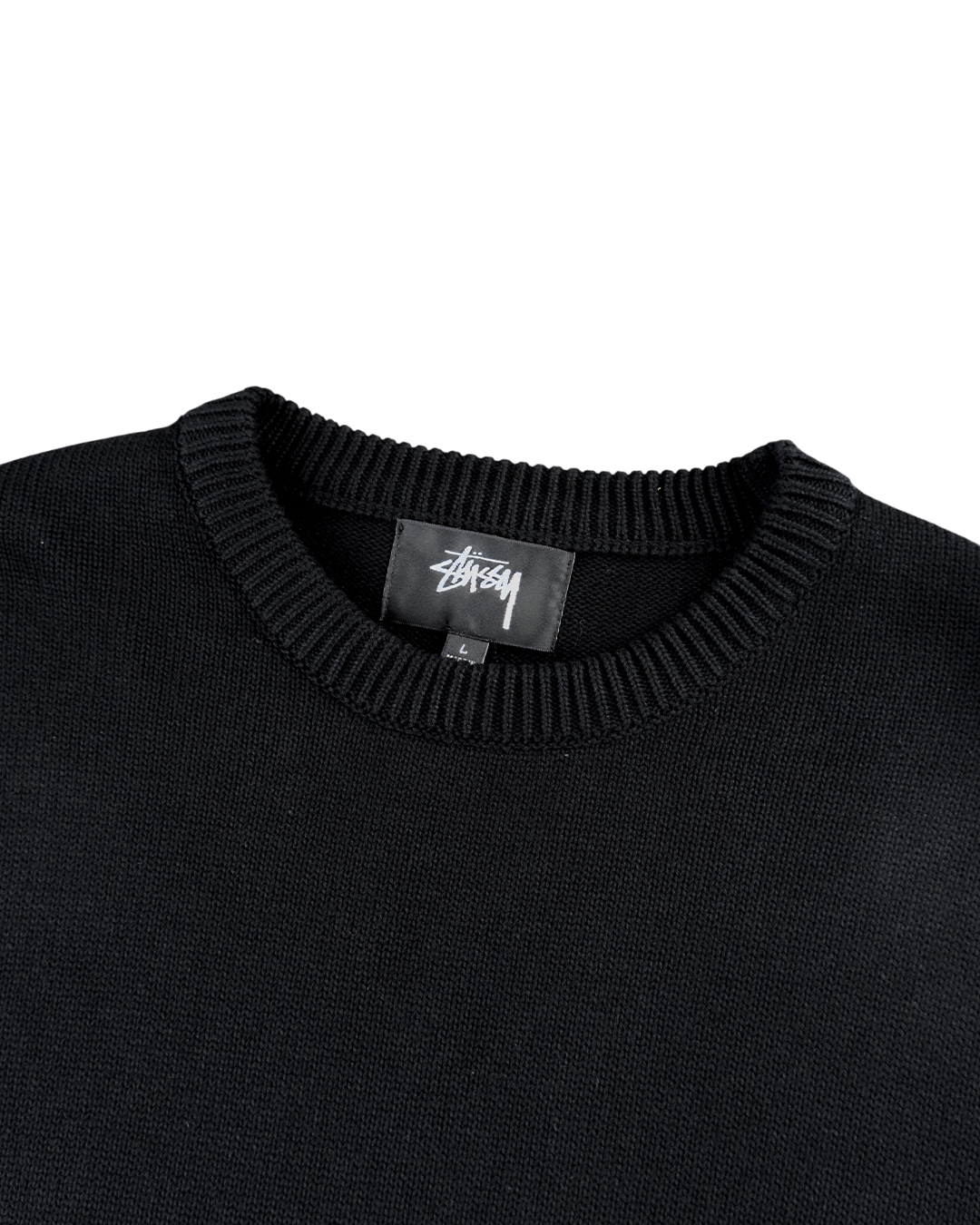 Светр чорного кольору від Stüssy. Має круглий ребристий виріз горловини, ребристі манжети та поділ. Доповнений яскравим принтом на спині.