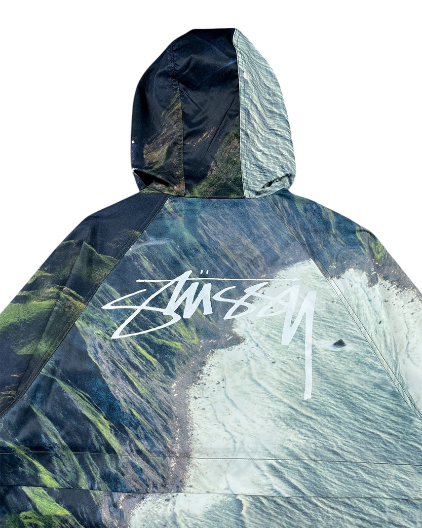 Куртка від STUSSY з капюшоном та еластичними манжетами. Застібка на двохсторонню блискавку, дві бічні кишені із застібкою на кнопки. Куртка прикрашена принтом скалистого берега, ззаду та зліва на грудях надрукований логотип Stüssy.