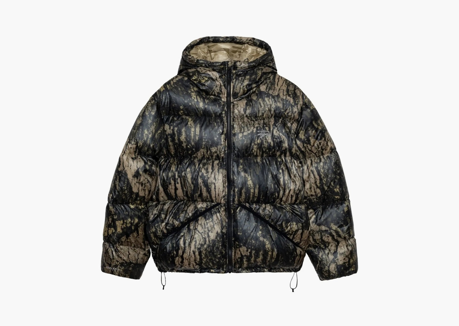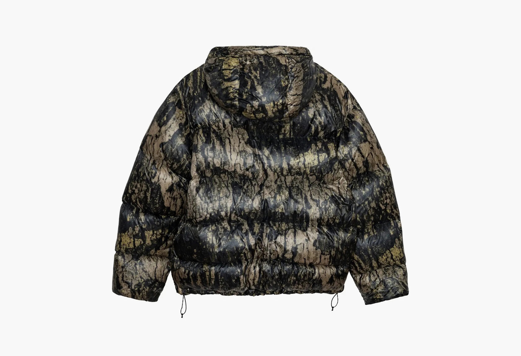 Парка від Stussy виготовлена з мікрорипстопу та качиного пуху щільністю 800. Має регульований капюшон та поділ зі шнуром, застібку-блискавку, передні кишені, внутрішні сітчасті кишені, еластичні манжети та контрастну підкладку з сеф-тканини. Пуховик доповнений вишитим логотипом Stüssy на грудях зліва.