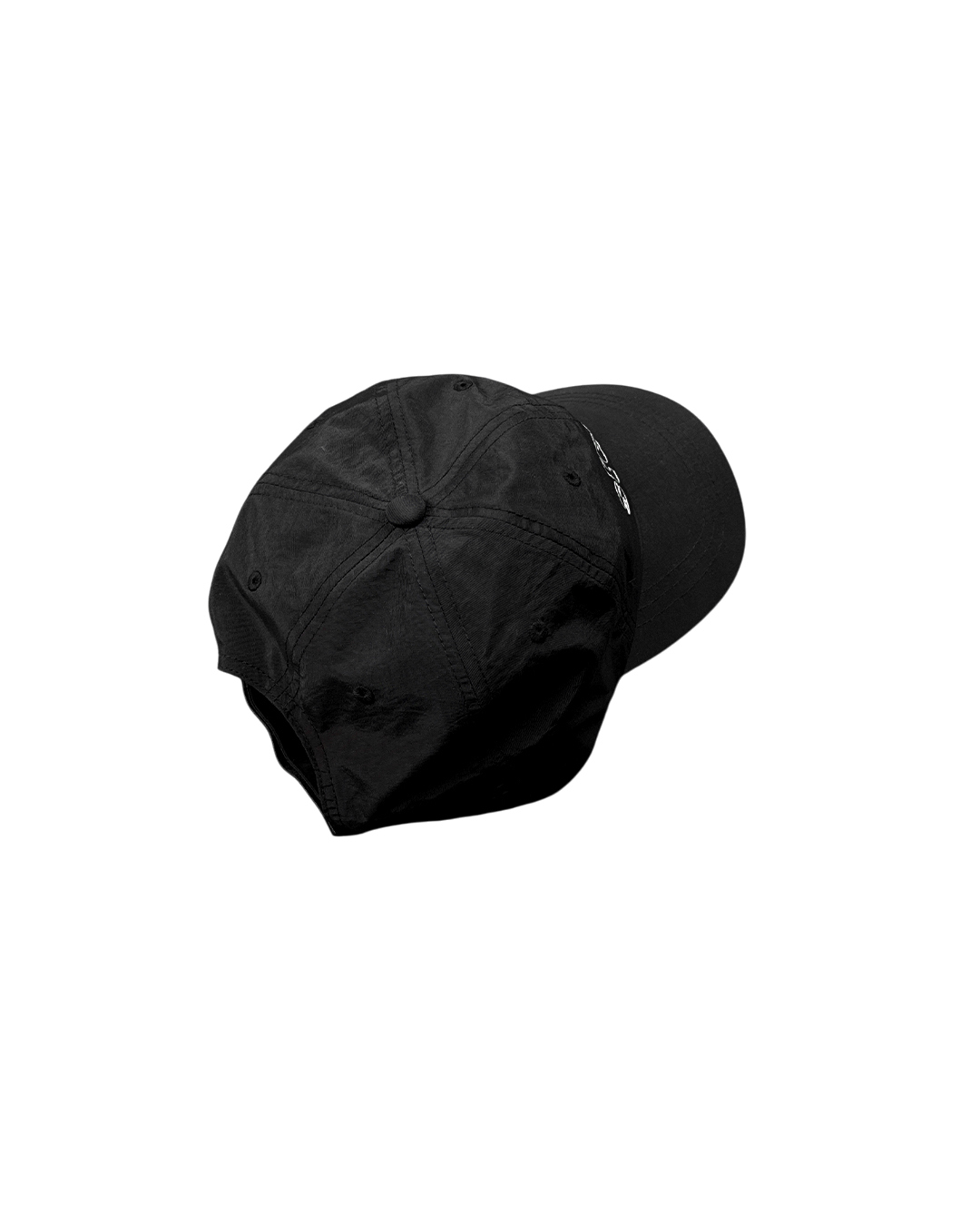Шестипанельна кепка від Stussy, виготовлена з чорного нейлону з структурованим козирком. На козирку нанесений світловідбиваючий логотип Stussy, який повторюється ззаду на застібці на липучці.