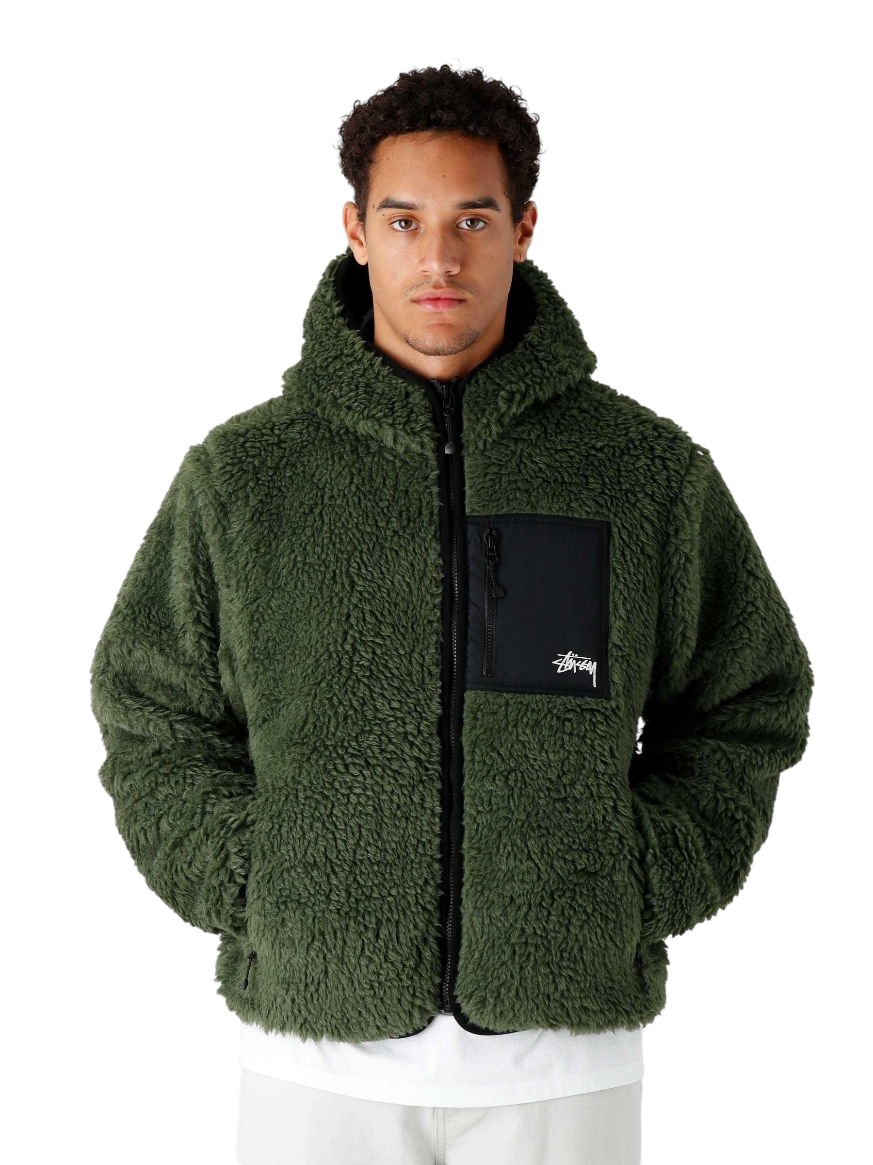 Ця куртка Stussy Sherpa Jacket виготовлена з шерстяного флісу оливкового кольору на чорній нейлоновій підкладці. Двостороння куртка з капюшоном має внутрішні та зовнішні кишені, нагрудну кишеню на блискавці з таслану з вишивкою логотипу Stüssy та застібку-блискавку спереду.