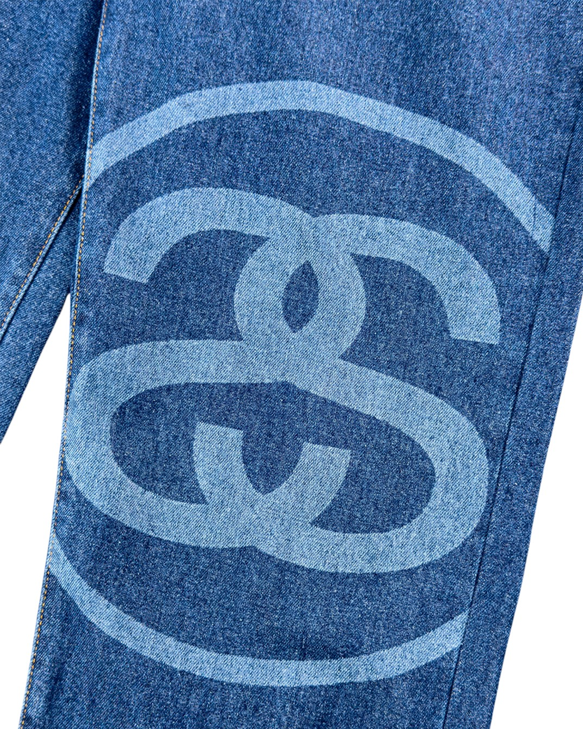 Джинси вільного крою з випраного деніму вагою 14,5 унцій з лазерним гравіюванням логотипу бренду. Доповнені кишенями та нашивкою з логотипом Stüssy на задньому поясі.