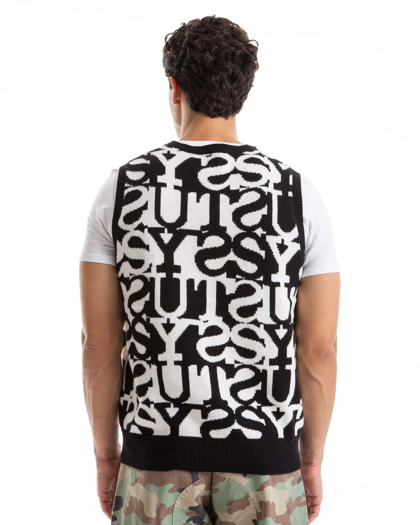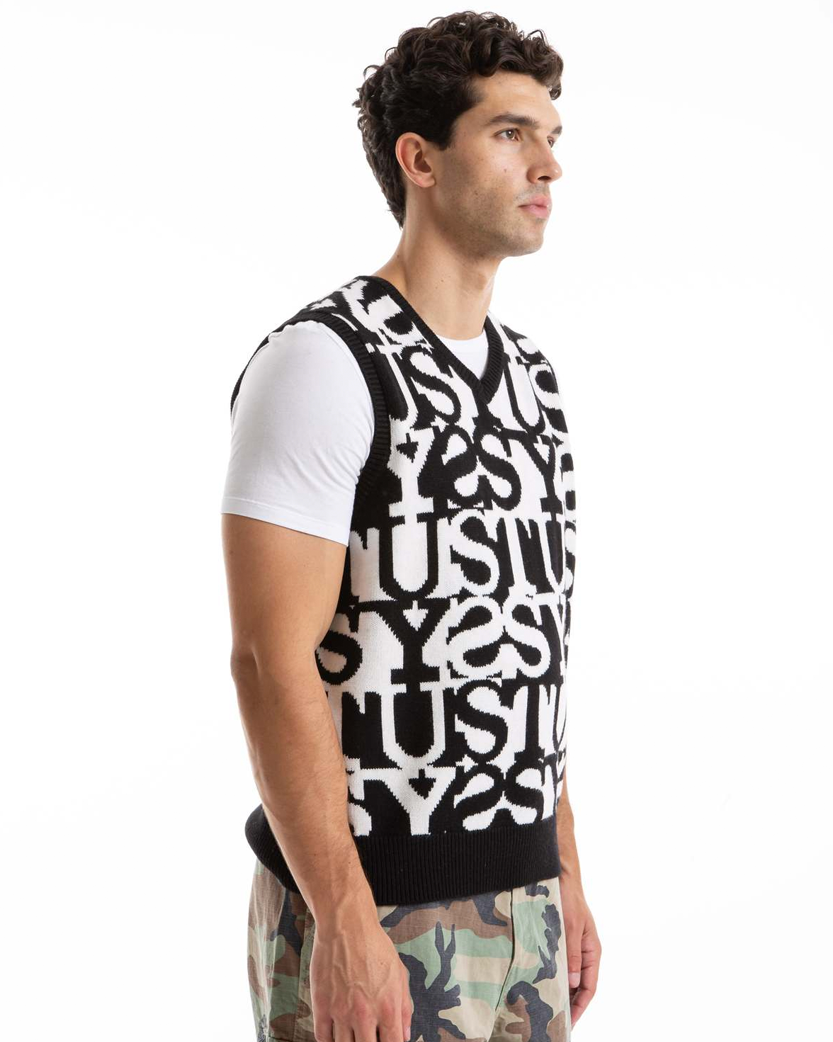Жилет-пуловер від Stüssy. Еластичний трикотаж із суміші бавовняної, нейлонової та вовняної пряжі з двоколірним візерунком у вигляді літер логотипу. Ребристий V-подібний виріз горловини, ребристі пройми та ребристий поділ.