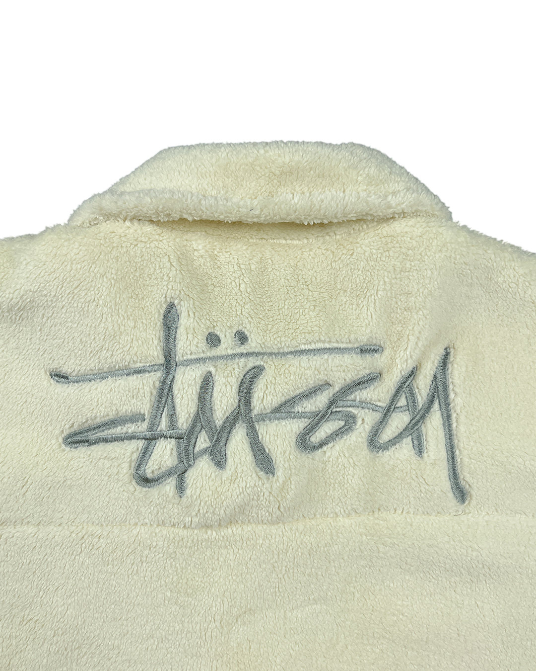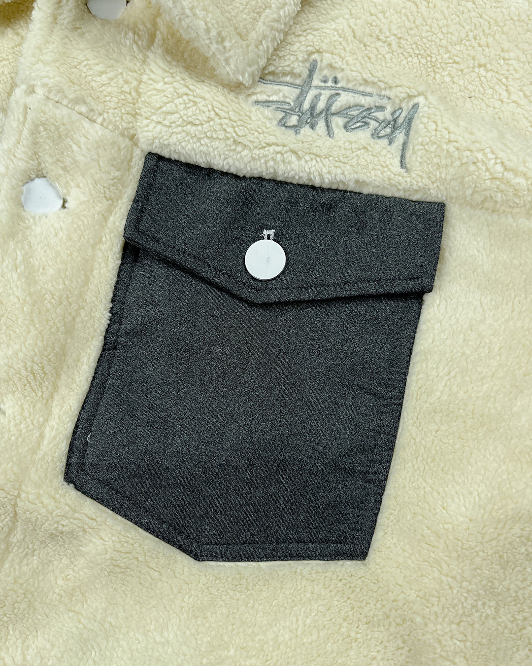 Флісова куртка STUSSY Teddy Jacket має застібку на кнопках, дві бічні кишені, дві нагрудні накладні кишені на кнопках, вишитий логотип Stüssy над однією з кишень та на спині.
