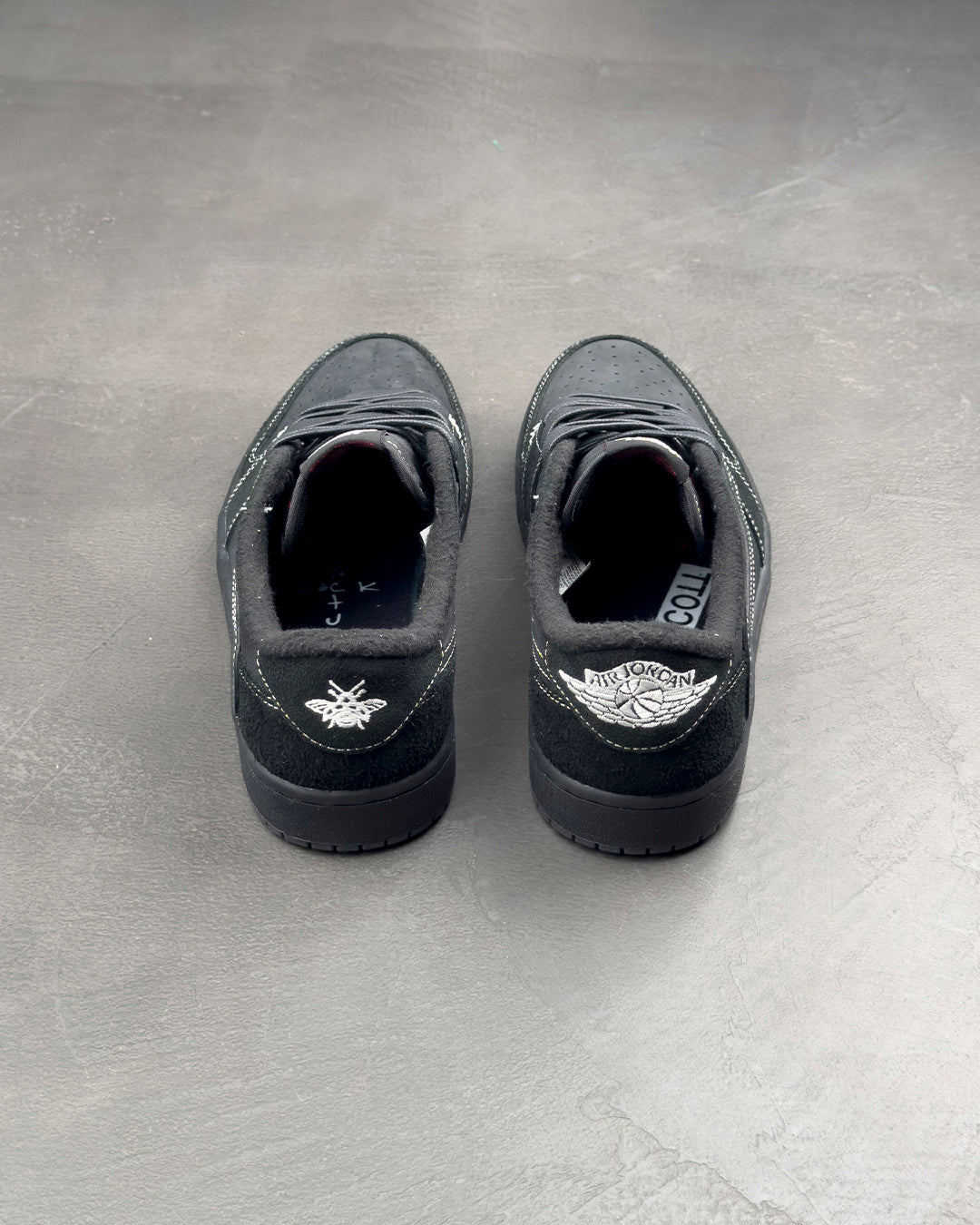Кросівки Travis Scott x Air Jordan 1 Low OG SP PS 'Black Phantom', поєднують в собі елегантну обробку з фірмовими штрихами La Flame. Низькі кросівки мають повністю чорний верх з нубуку та замші з контрастними білими швами. Задній край прикрашає логотип Swoosh Скотта, а язички прикрашають плетені ярлики Nike. Невідповідні п'яткові вкладки відображають логотип Jordan Wings на правому кросівку та графічний малюнок бджіл на лівому. Основу кросівок складає чорна гумова підошва з прошитою конструкцією боковин.