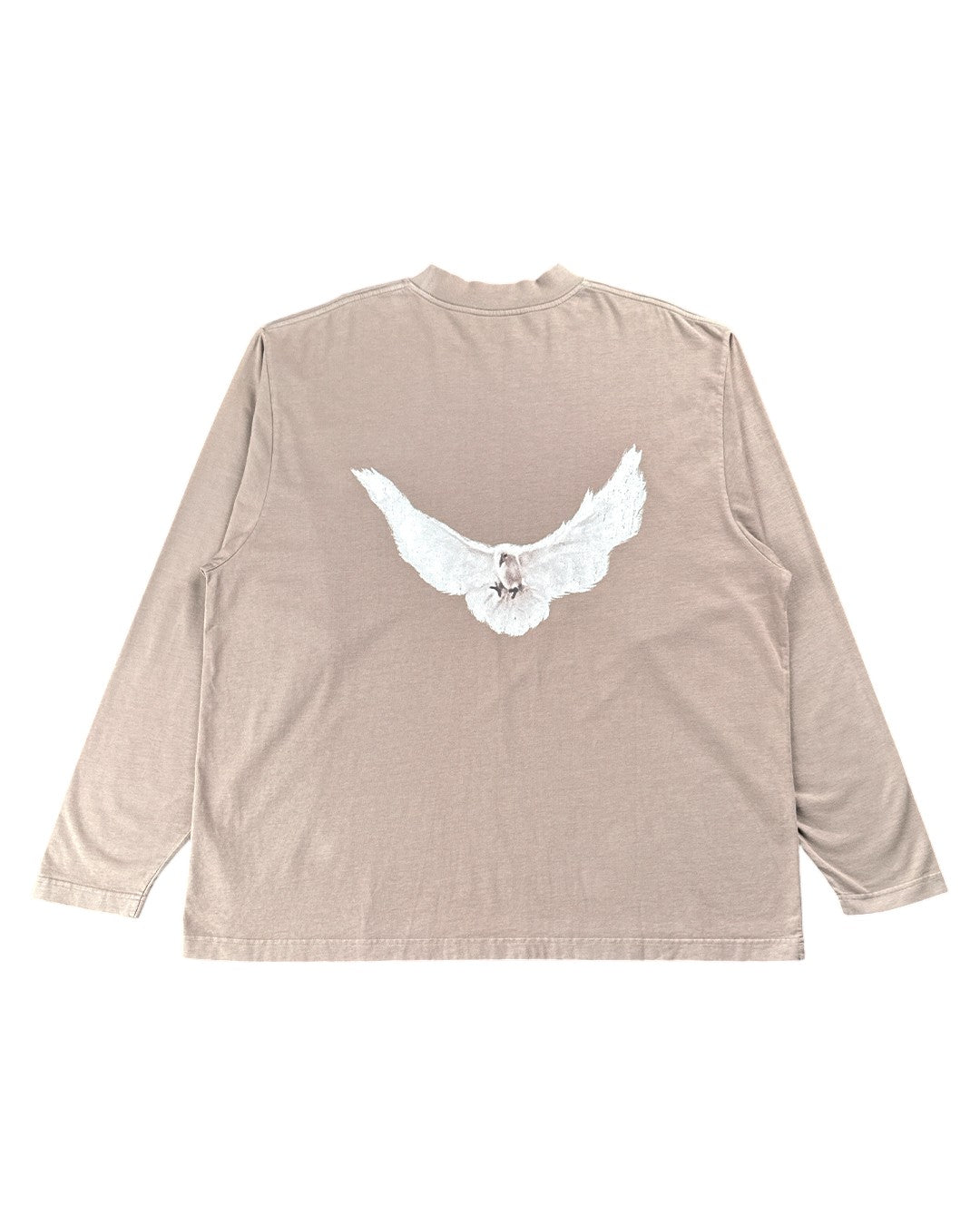 Лонгслів від Yeezy Gap виготовлений з високоякісної бавовни. Має вільний крій, круглий виріз горловини і довгі рукава. Прикрашений логотипом GAP спереду та принтом із зображенням голуба ззаду.